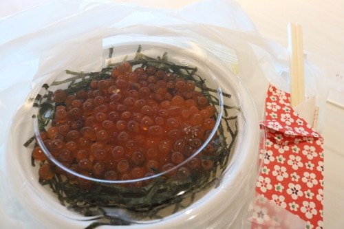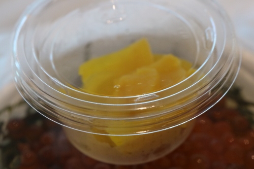 いくら丼ミニ1,680円には、たくわんが添えられていました。機内でいただきました。