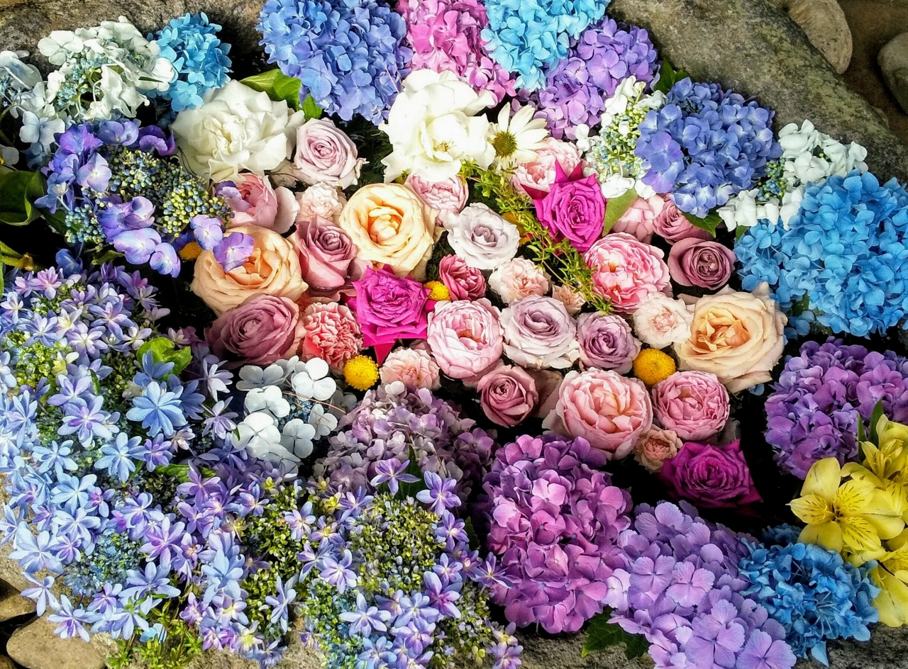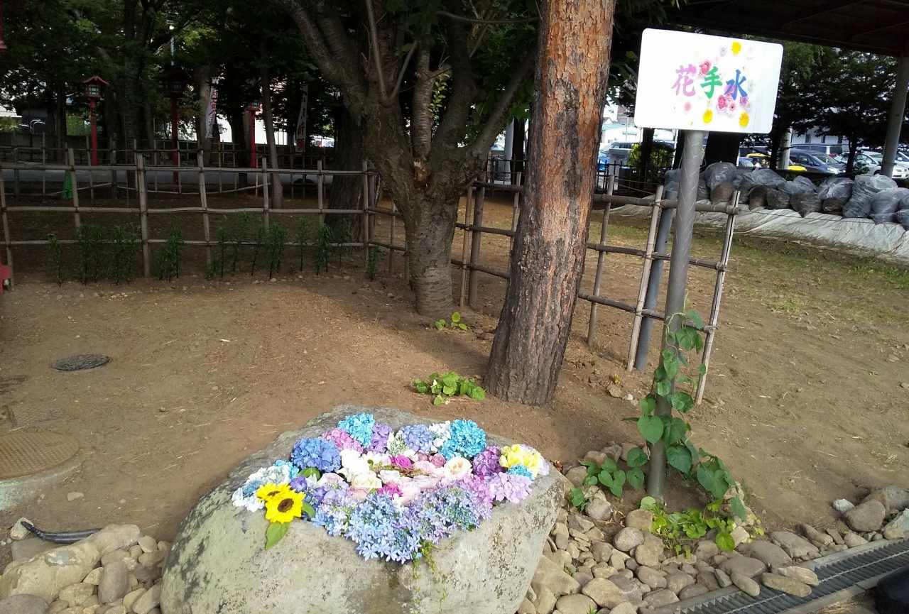 紫陽花やバラ、ひまわりなどキレイなお花が小さな手水鉢いっぱいに溢れ、ほっこり…♪