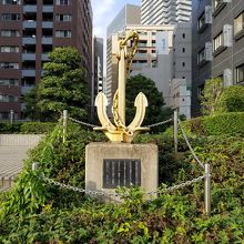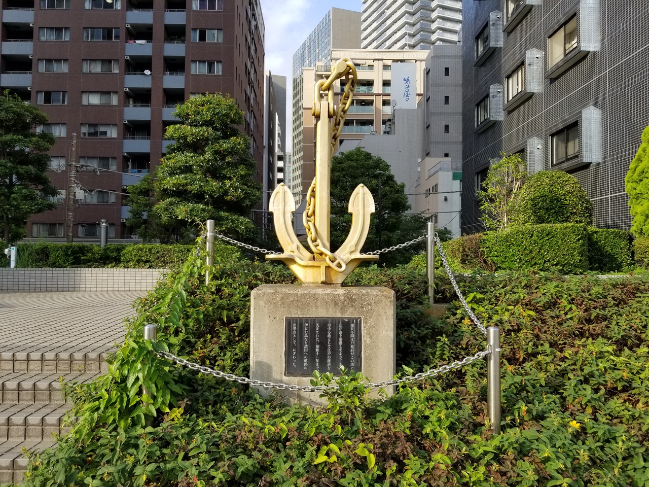 隅田川テラスの始端に金色のイカリをかたどった目立つ記念碑が建っている。
