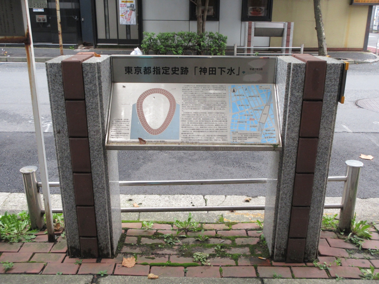 神田駅西口前の多町大通りに東京都指定史跡神田下水の碑があります。神田下水が造られた由来や担当者名や建築状況などがわかりやすく記され、埋設されている場所の地図と断面図があります。レンガ積み管の下水道は現在でも使われていて、当時の技術とその後の適切な維持管理に驚きます。明治にコレラが流行ったことが建築理由でした。神田駅南口近くにある今川橋由来碑と合わせて読むと川に町の下水を流していたことの関係が実感として伝わりました。