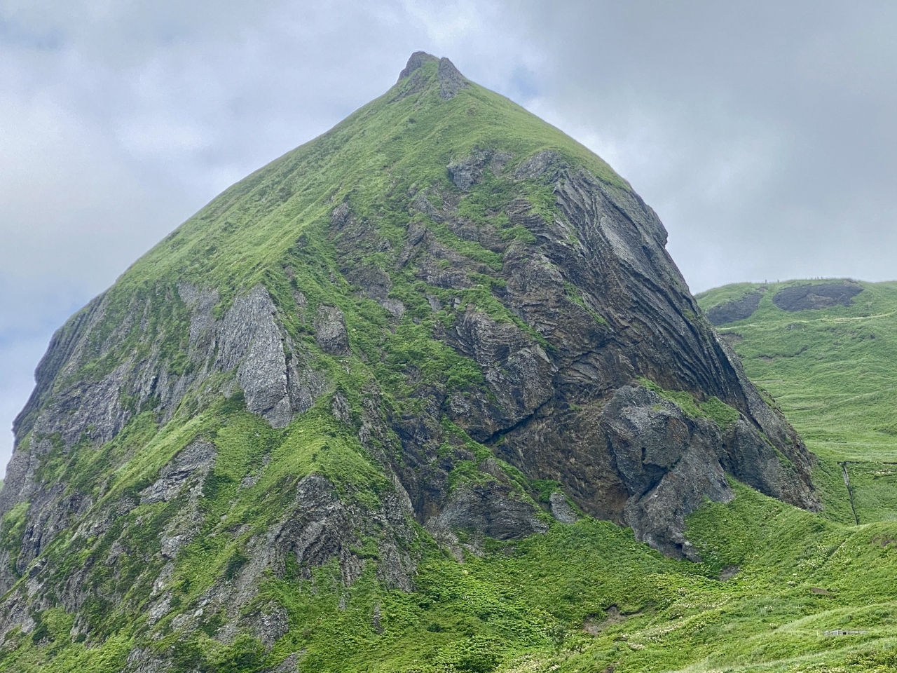 桃の形だけが言われる桃岩ですが、元地海岸側から眺めると桃を縦に輪切りにした形に見えて、溶岩ドームの形成過程を見ることの出来る、世界的にも珍しい岩らしいです。