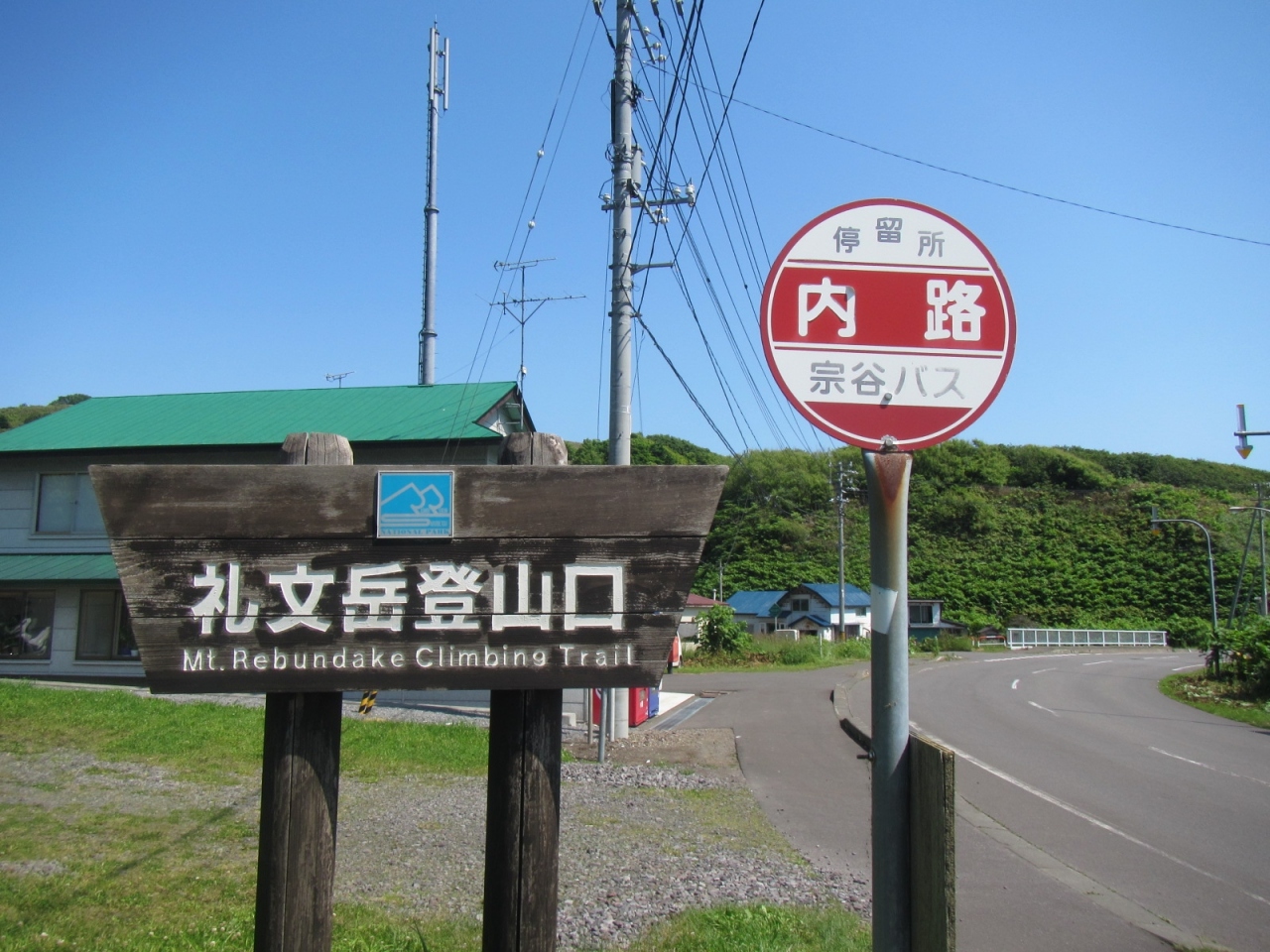 標高490m。海沿いを走る道道40号線の内路のバス停前に登山口があるため、ほぼ海抜0m付近から登り始めます。そこに車やバイク4、5台が停められるスペースと、日差しが遮られて椅子に座れる東屋があります。近くにお店は見当たりませんでしたが、すぐ隣の民家の前に飲料の自販機があって、水や清涼飲料水を調達できました。