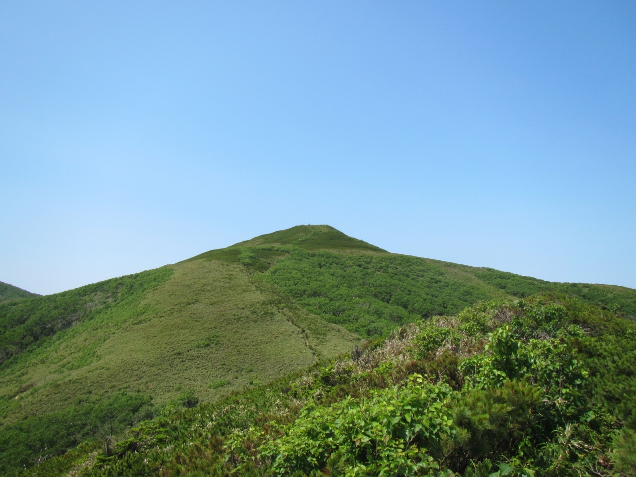 そして、その3分の2を越えた辺りから尾根に出て見晴らしが良くなると、海に浮かぶ利尻島や利尻水道を跨いで北海道本土、礼文島の北部の地形が見えるようになります。ただ、今まで緩やかだった登山道にやや険しさが出てきて、下りの局面も現れるようになりますが、その後の登りかえしがキツく感じます。しかし、もう山頂は見えているので、頑張れば程なくで山頂に到着します。