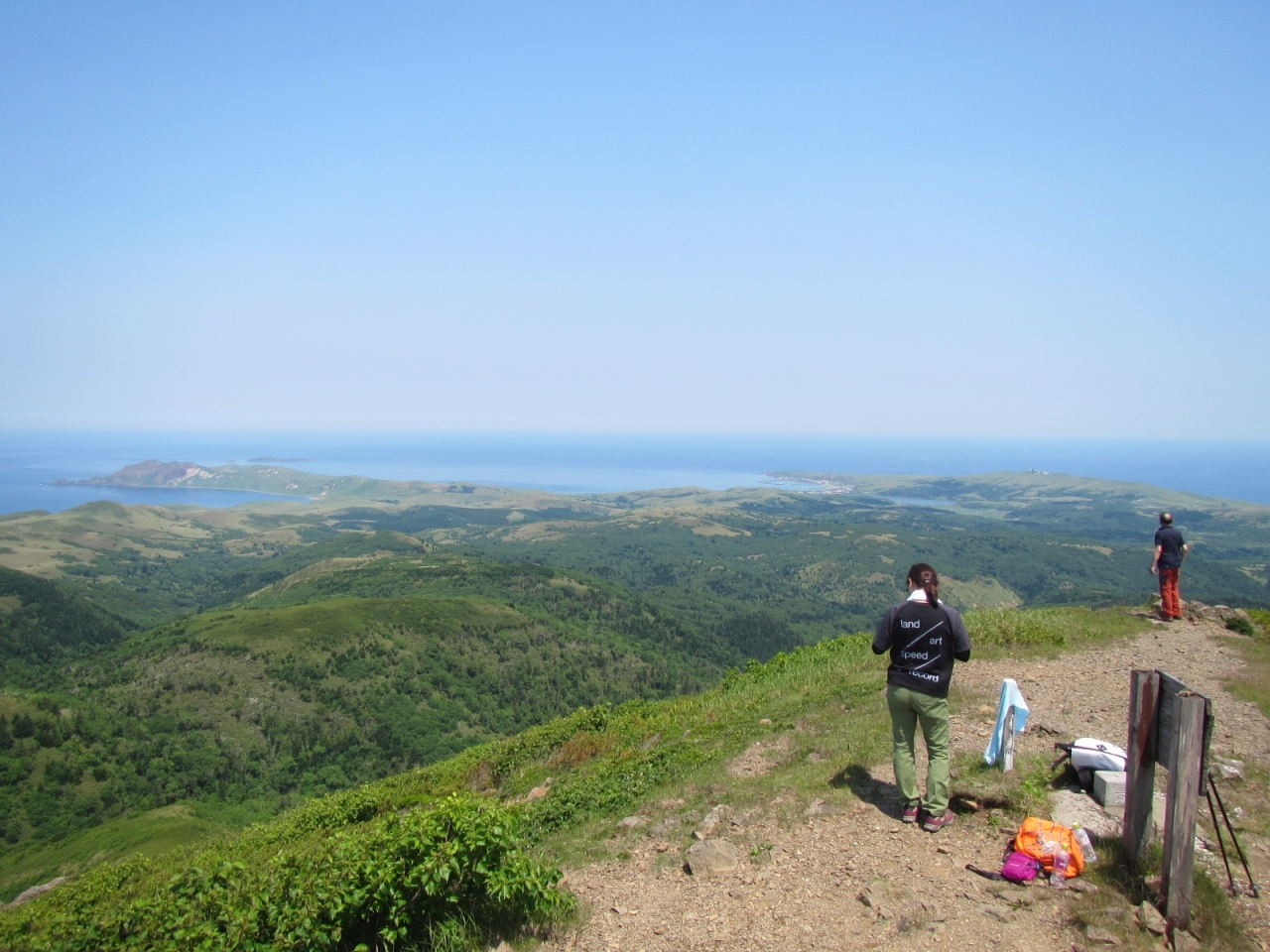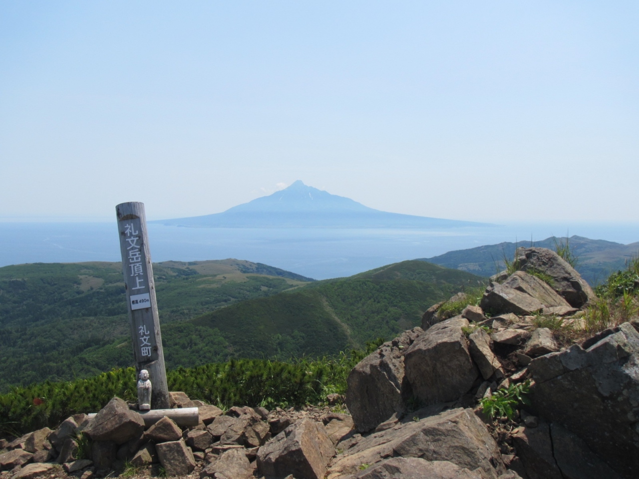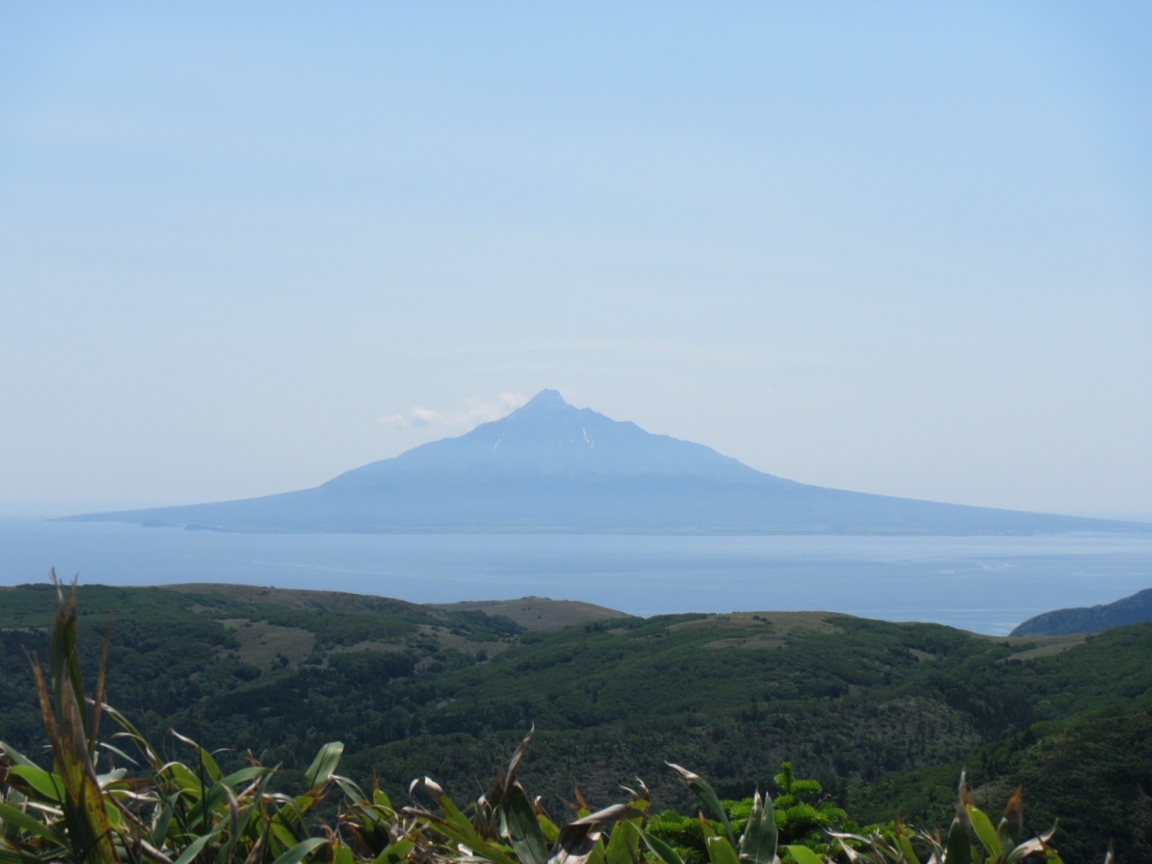 山頂からは島の全景が見えます。特に、島の北側の地形が面白い程よく分かり、地図のとおりに見えていました。晴れた日は爽快で、利尻島が正面にそびえる様子は感動的です。利尻水道を挟んで北海道本土も見えましたが、訪れた日は残念ながらサハリン方面は見えませんでした。