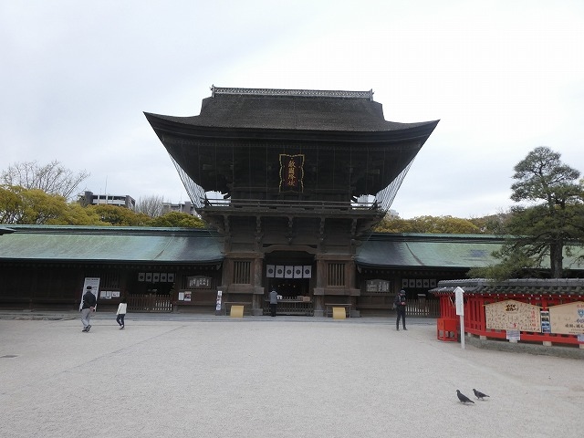福岡市の筥崎宮。鳥居をくぐり、境内に入っていくととても目立つのが楼門です。ぽこっと突き出た形は、ほかの神社ではあまり見かけない気がします。小早川隆景が1594年に建立。国指定の重要文化財です。元寇の時、亀山天皇が書いたとされる「敵国降伏」の額が掲げられていることから「伏敵門」と呼ばれています。といってもあの額、2003年の復原とか。そりゃそーだろうなあ。