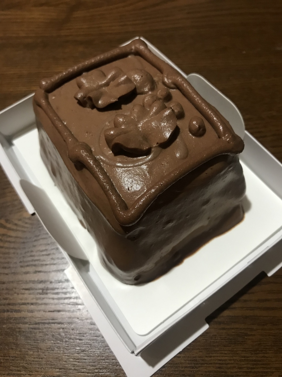 チョコレートケーキのトップスになります。小振りなサイズですが、なかにはくるみなどのナッツ類に、チョコレートクリームとスポンジだけのシンプルなチョコレートケーキではありますが、病みつきになるケーキです。
