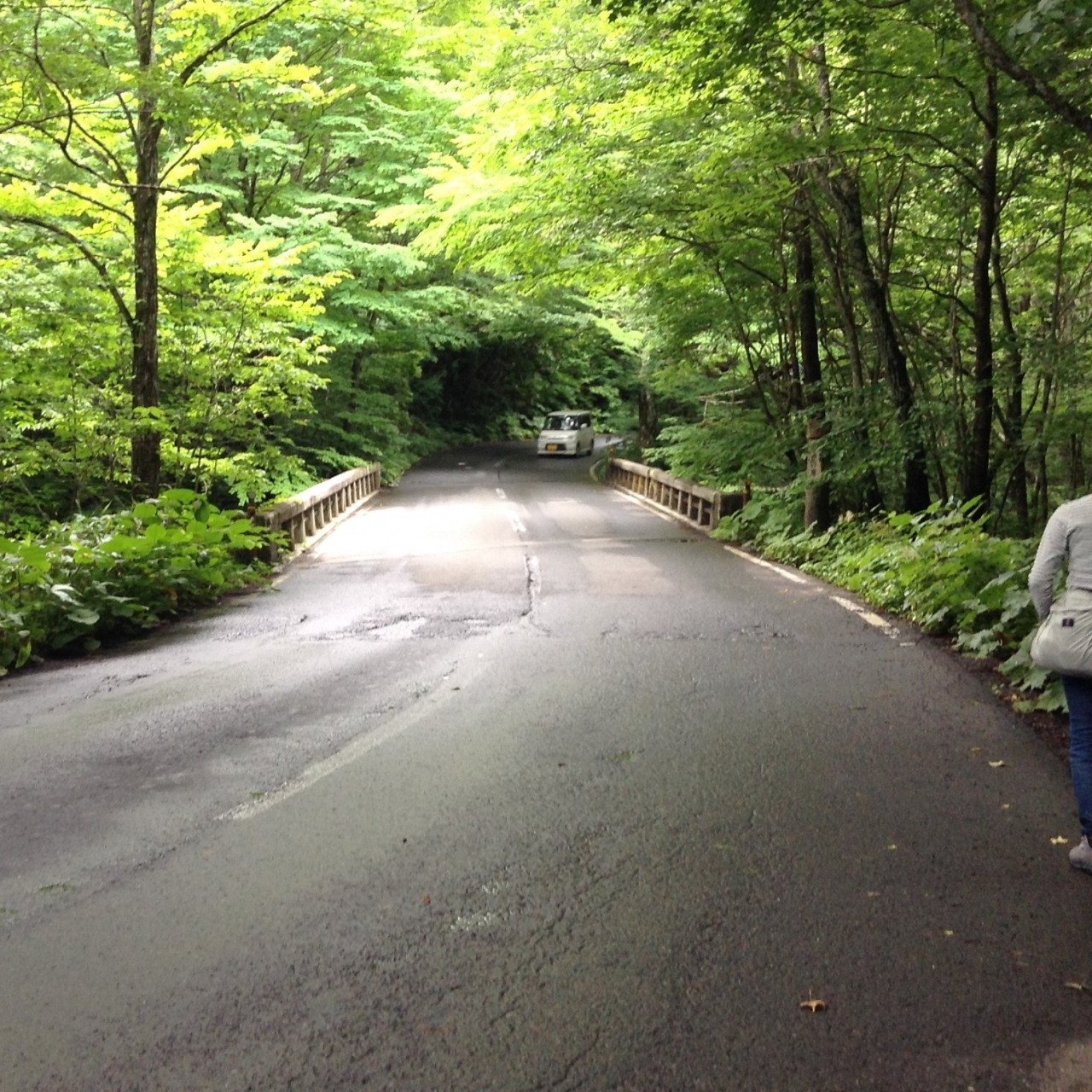 奥入瀬渓流と平行して走る車道で、名所が両サイドにあるため、わき見運転が多いようです。路肩が狭いので自転車はかなり注意が必要。歩道が途切れ、路肩を歩かざるをえない歩行者に、雨で濡れた路面の水を容赦なくかけていく車がいました。