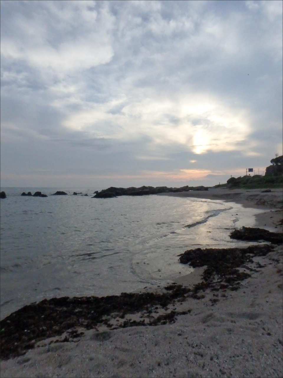 海水浴場からさらにビーチを西に進むと、海蝕された巨大な奇岩がゴロゴロしていてちょっと面白い景観が広がっています。さらに西に進むと県の天然記念物の屏風岩もあります(私はこれを見そびれました)。海水の透明度は高くて岩場で磯釣りをする地元の方もいらっしゃいました。夏の夜には満天の星空と海にかかる天の川が見渡せるそうです。