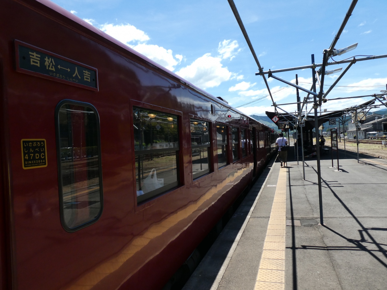 途中の人吉駅までは熊本駅から蒸気機関車の「SL人吉号」で球磨川の眺めを堪能、1時間ほどの乗り継ぎ時間で人吉駅から先は途中の駅で降車観光が出来る「いさぶろう・しんぺい号」で日本三大車窓を含む鉄道の旅が楽しめました。