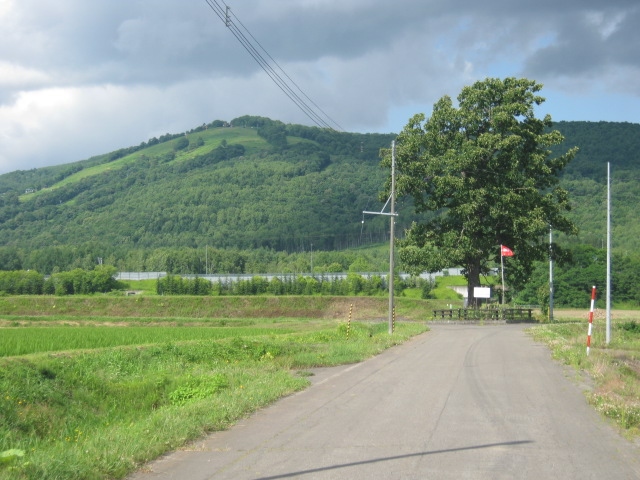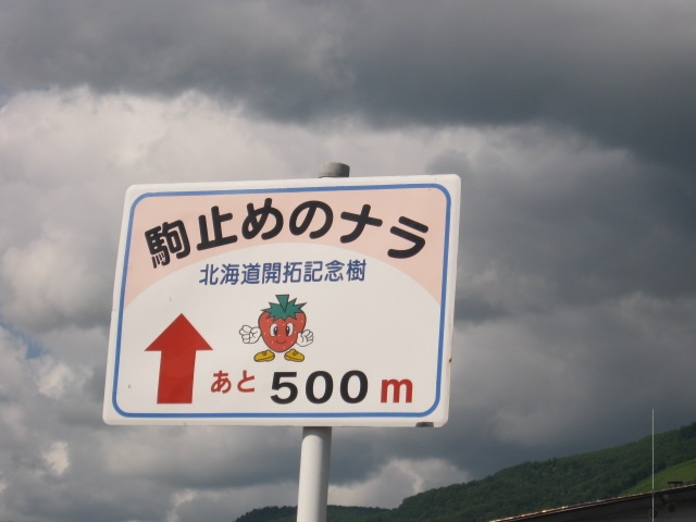 比布市街地からはやや北東寄り、国道40号線から少し東に入ったところに静かに立っている木がこちらです。国道脇に比布町が設置したイチゴ柄の小さな看板がありますので、これが分岐の目印となります。そこから東に直進すると、正面に立派な木が見えてきますので、すぐにそれと判るかなと思います。