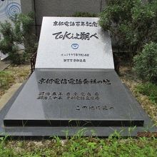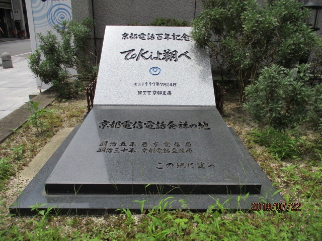 京都電信100年記念碑は、NTT京都支店の敷地内、三条通り沿いに京都電信発祥の地とともにあります。これはタイムカプセルでなにか埋められていたようですが、100周年の年に開けられたのでしょうか。なにが入っていたのか、気になります。