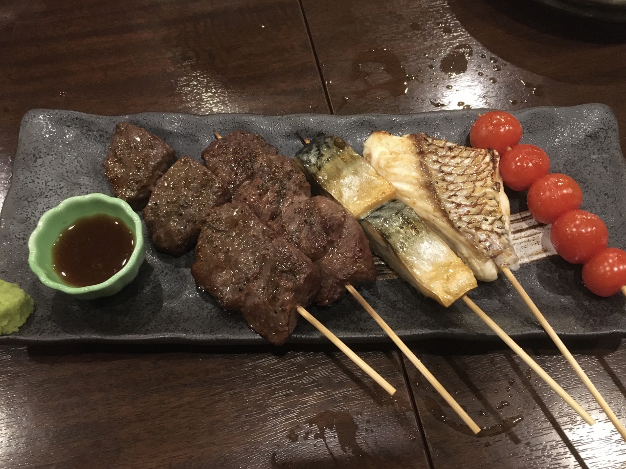 立川駅北口の飲み屋街の地下にある海鮮系メインの居酒屋です。テーブル席中心でひろくはありませんが、ゆったり落ち着いた店内です。豊洲直送の海鮮で刺身のほか、串焼も魚系の焼き物メニューがありました。串盛り合わせは肉と魚が混ざります。後で気づきましたが時間制の飲み放題もありました。