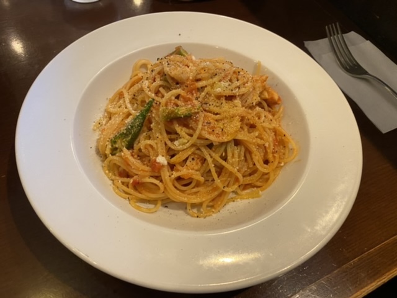 食べたのはパスタランチ!スパイシーチキンとオクラのトマトクリームスパゲッティを選びました。美味しかったですよ(^^)