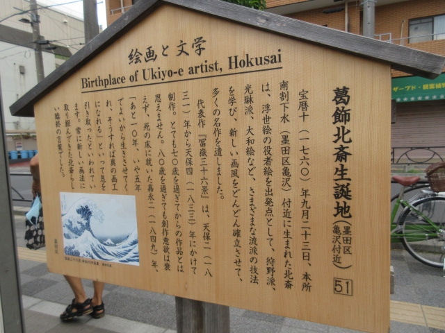 両国にありました。両国には北斎美術館があったり、住居跡があったりもするのですが、この生誕の地にも案内板が立っていました。両国の駅から5分ほどの場所、緑町公園の道路わきに看板が立っています。看板以外には特になにがあるわけではないけれど、せっかく美術館にきたならセットで見学してもいいかも。