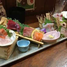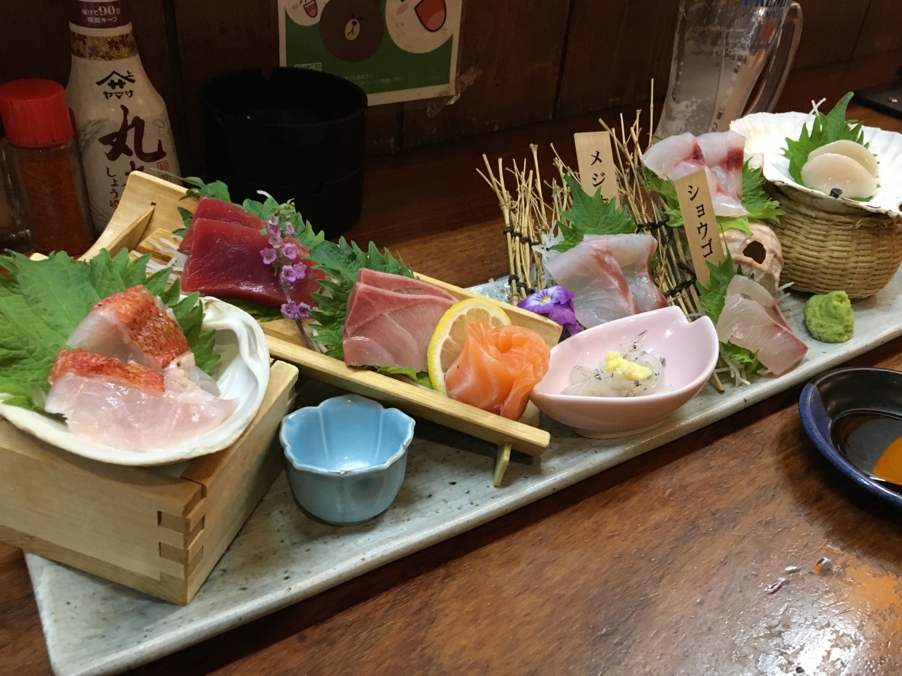 小田原駅東口から近い飲み屋街のはずれにある海鮮中心の居酒屋です。店内は広く、テーブル、小上がりまであり、グループの宴会向けです。刺身の盛り合わせは姿造りも入りますが、リーズナブルで見た目も美しい盛り付けでした。