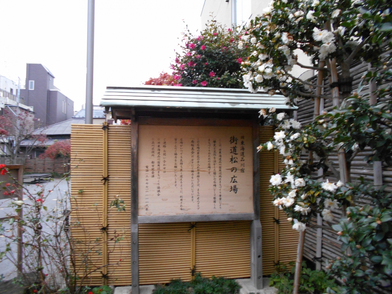 かつて品川は東海道五十三次の第1の宿場町として栄えた歴史があります。街道のシンボルである松を植える事業を「品川宿まちづくり 交流事業」の一環として行っているそうです。浜松宿から贈られた松の木が植えられ、市民の憩いの場になっています。
