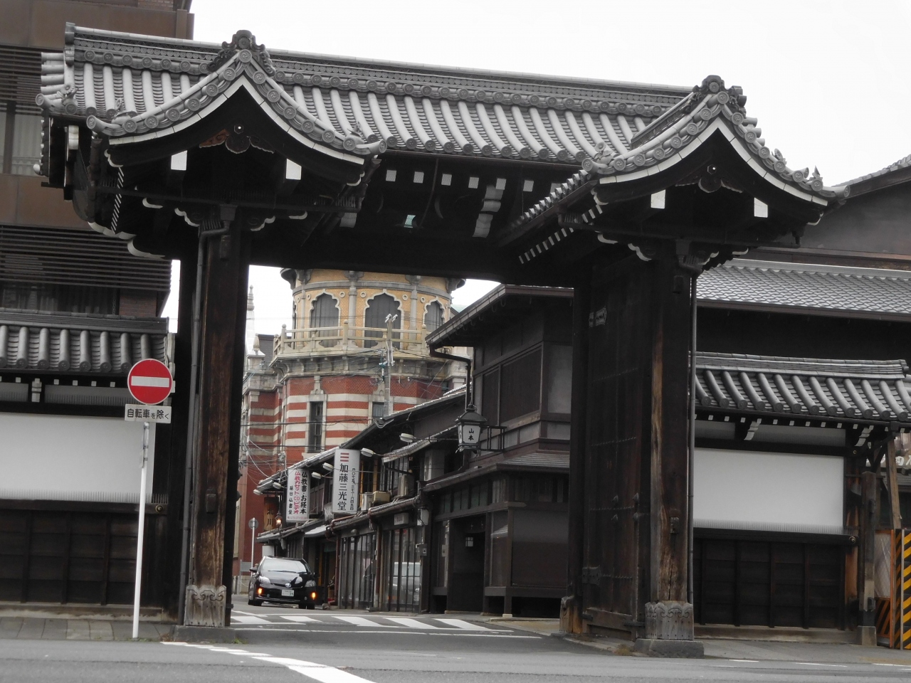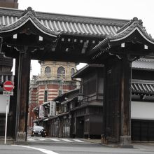 堀川通に面して通りを挟んだ反対側に建っています。この総門から寺を見ると、通りの向こうに御影堂門、そして境内の大イチョウ、御影堂があります。