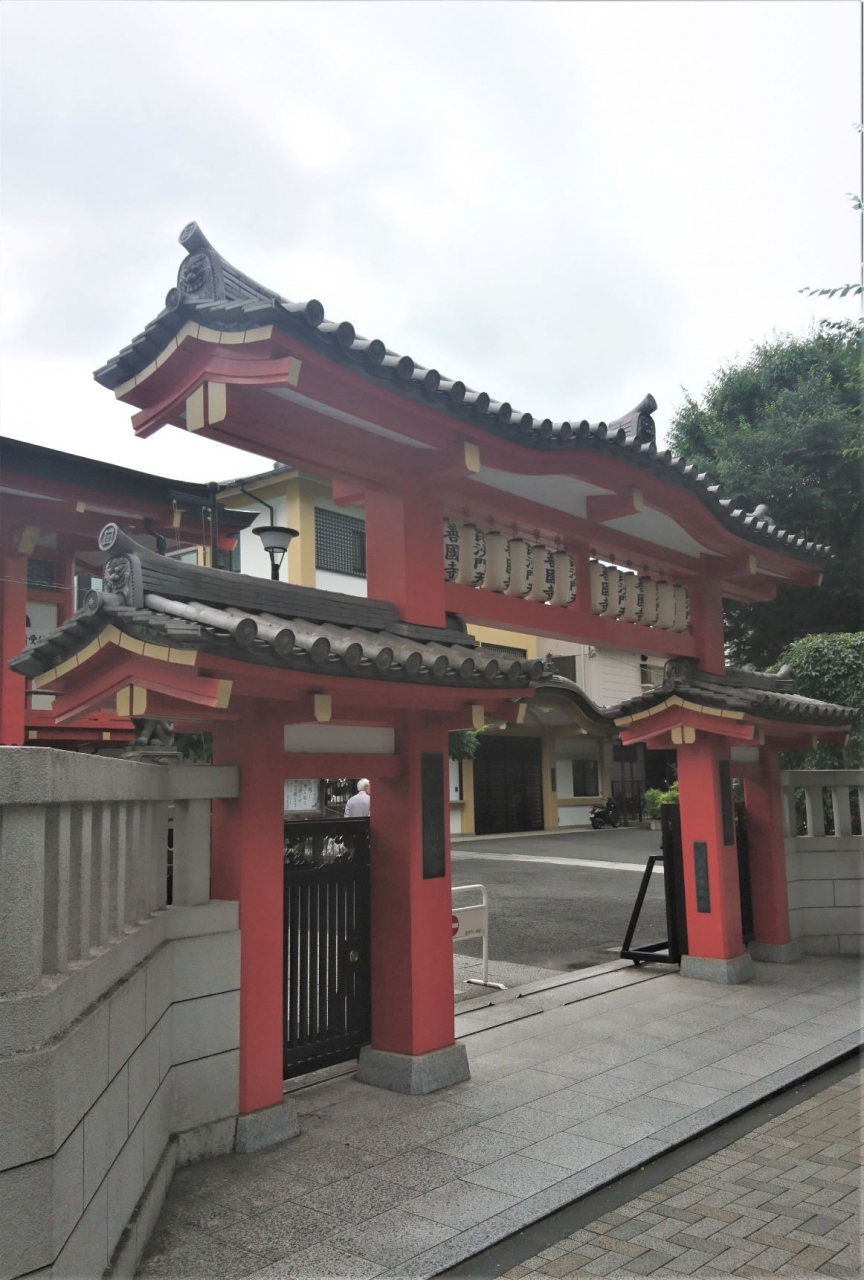 神楽坂の中間地点、外堀通りからの大久保通りへ向かって上ったきた坂上にある朱塗りの門が目立つ寺院、境内は色々なイベントが催される。江戸三大毘沙門の一つだけあって、毘沙門天が祀られている。神楽坂散策の名所のひとつ。