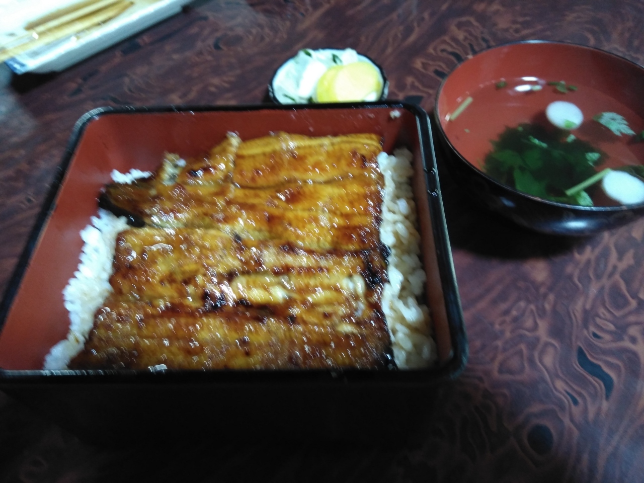 古い店舗で場所的に客は少ない?と思いきや、テーブル、小上がりも次々来るお客であっという間に満席状態でした。知る人ぞ知る老舗のようで、鰻の他にラーメンや丼もの、定食とコスパ良いメニューもありましたが、皆さん鰻注文でした。うな重(上)\2700で美味でした。5歳の孫は焼き鳥とつくね焼、大人の鰻を味見しました。