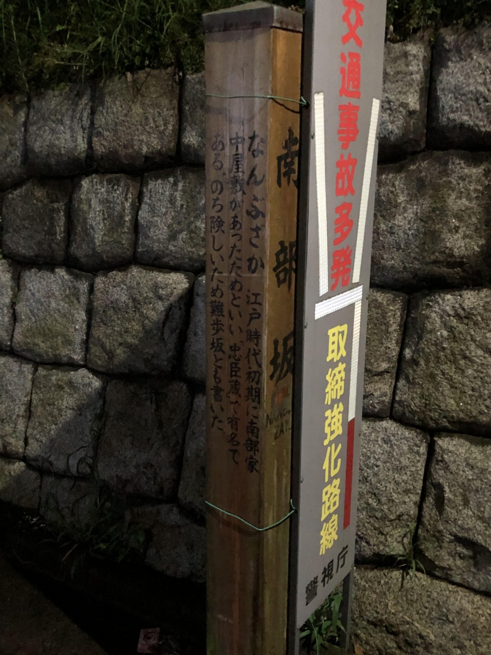 六本木と赤坂の境界線になっています。せっかくせまく傾斜が続き、どこか暗い雰囲気のある坂で風情があるのに、行き交う車の通行量が多いので注意しましょう。坂の案内柱にも交通事故注意の看板が結びつけられているほどです。