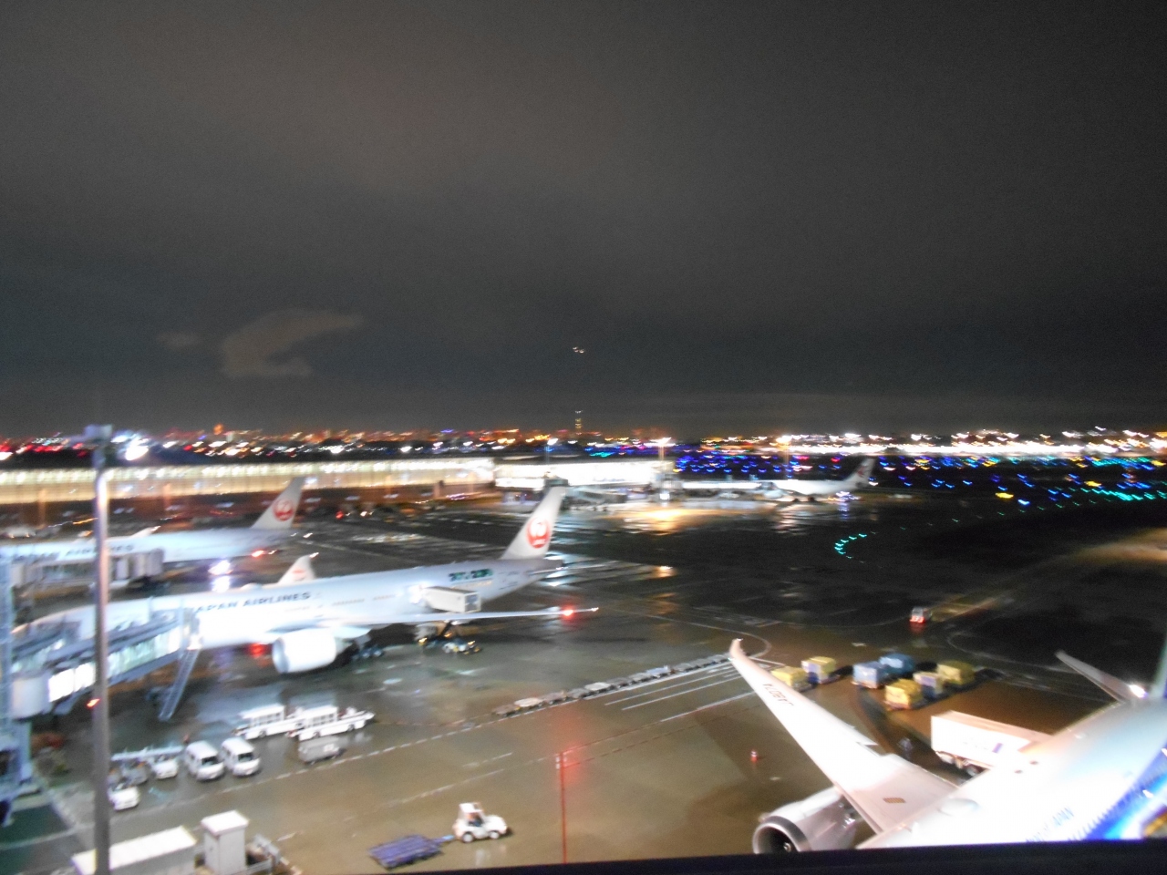 搭乗手続き前に羽田空港国際線の5階にある展望デッキに立ち寄って見ました。深夜だったので離発着は多くはありませんが、4つの滑走路の誘導灯が夜空に向かって一直線に伸び、ロマンチックな光景です。24時間解放なので夜景も楽しめるビューポイントとなっています。フェンスは金網タイプではなく、ロープタイプなので視界が良く、写真撮影も楽しめます。