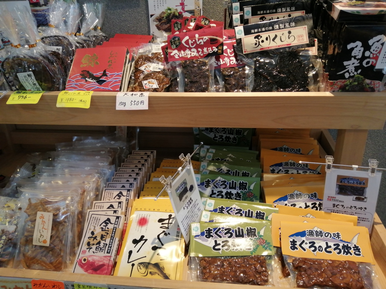 太地町はクジラの町として有名で、お土産売り場にはクジラやマグロを使ったものが多くありました。