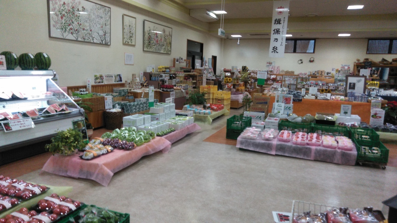 ご当地道の駅に大型のスーパー並みの店舗があるほか、レストラン「はりまいちのみや」も営業、駐車場入り口には、土産物店ではないが、農産物直売所「食彩館 伊和の里」が