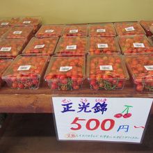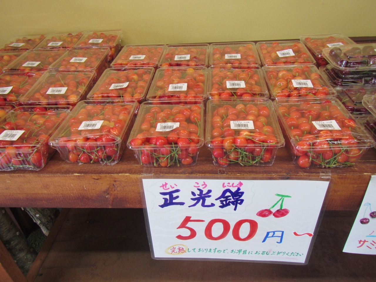 訪れた時は、味の良い佐藤錦は、札幌などのスーパーで売っている量、価格と同じくらいでしたが、水門、それに正光錦という品種は、大型パックにたんまり入って¥500円と、産地ならではのお買い得価格でした。