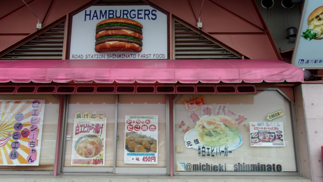 富山湾名産のシロエビ料理(バーガーや唐揚げ)が売り物のようであるが、4月から7月くらいが漁期のようだが、シロエビの旬といっても、実はとても傷みやすいため、水揚げしてもほとんどはすぐに冷凍され、それを解凍して料理しているらしい。