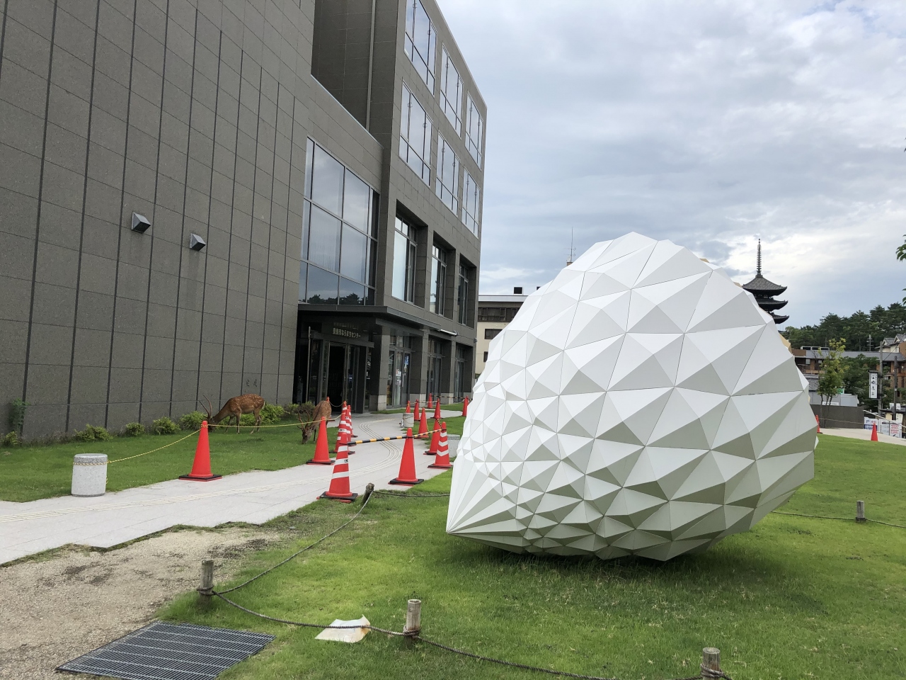 建物の前庭で、鹿が2頭、草を食んでいました。猿沢の池のすぐ横にある施設ですが、こんなところにも鹿が来るんですね。建物自体は普通のデザインの建物ですが、庭にある大きなまつぼっくり(たぶん)のオブジェが目をひきました。