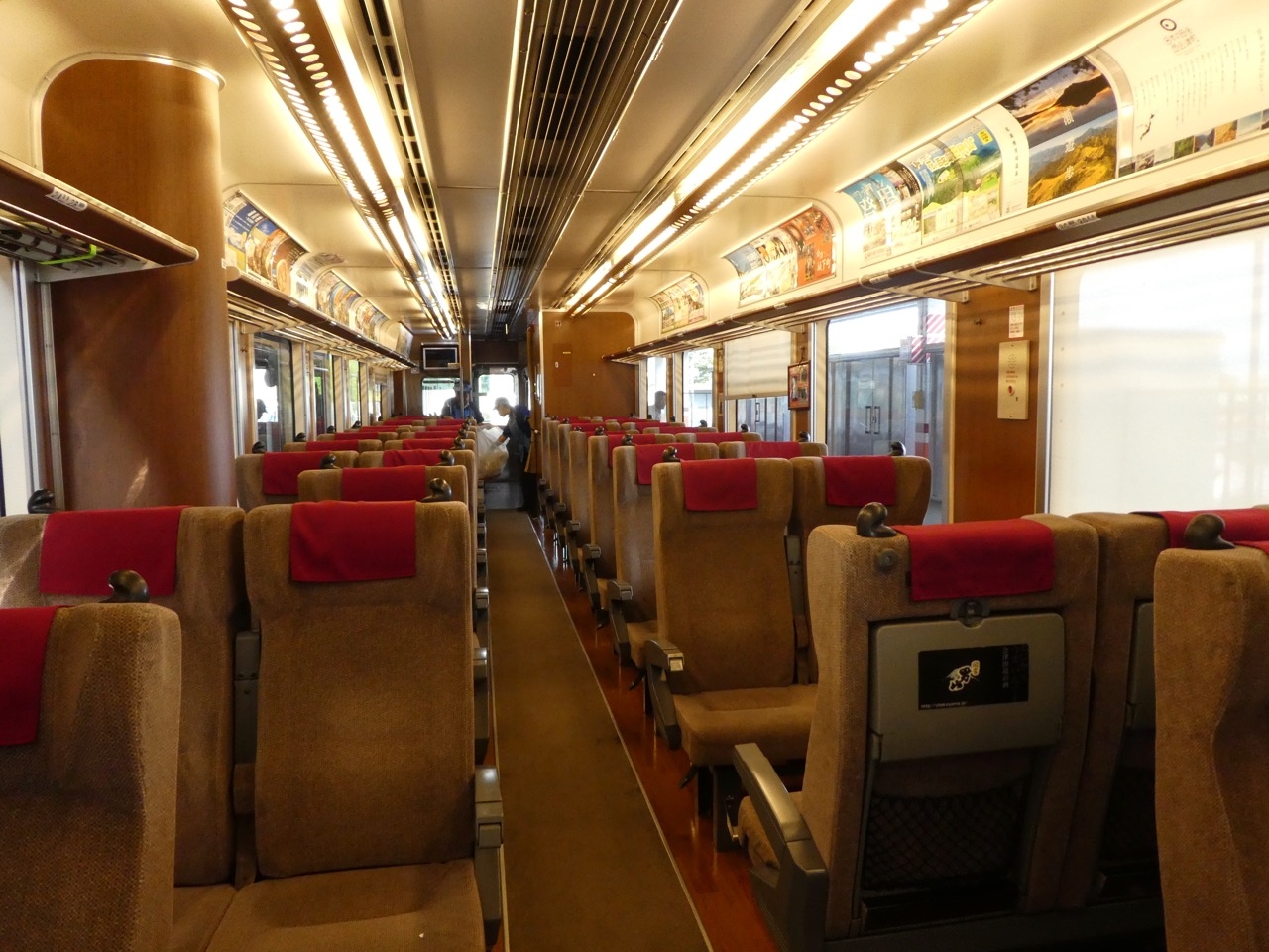 さて、2両編成でそれぞれ別の塗装の車両でした。車体自体は普通の地方用気動車ですが、豪華なリクライニングシートで快適です。スペーシアからの乗り継ぎは普通はボックシートの電車ですが、この列車にあたるとラッキーです。浅草14時発のスペーシアです。ただ跨線橋渡っての乗り換えになるので、前の方に席をとっておいた方がいいでしょう。
