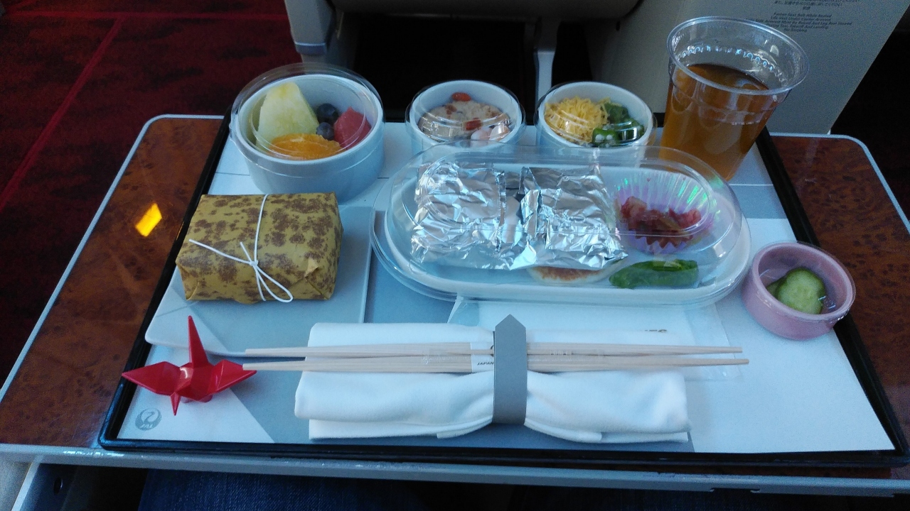 羽田行きのメニューは和食でご飯は、俵型になっており、お魚とフルーツが付いております。