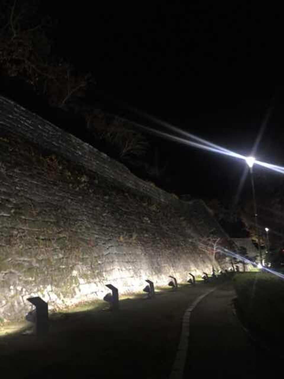 夜は石垣が控えめにライトアップされますが、あとは真っ暗で、少々怖い感じがします。