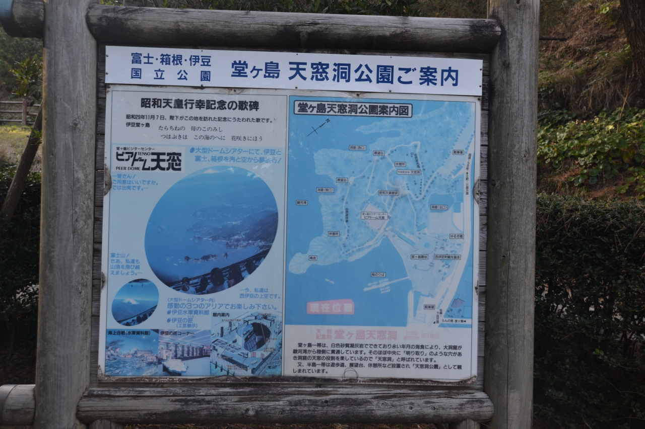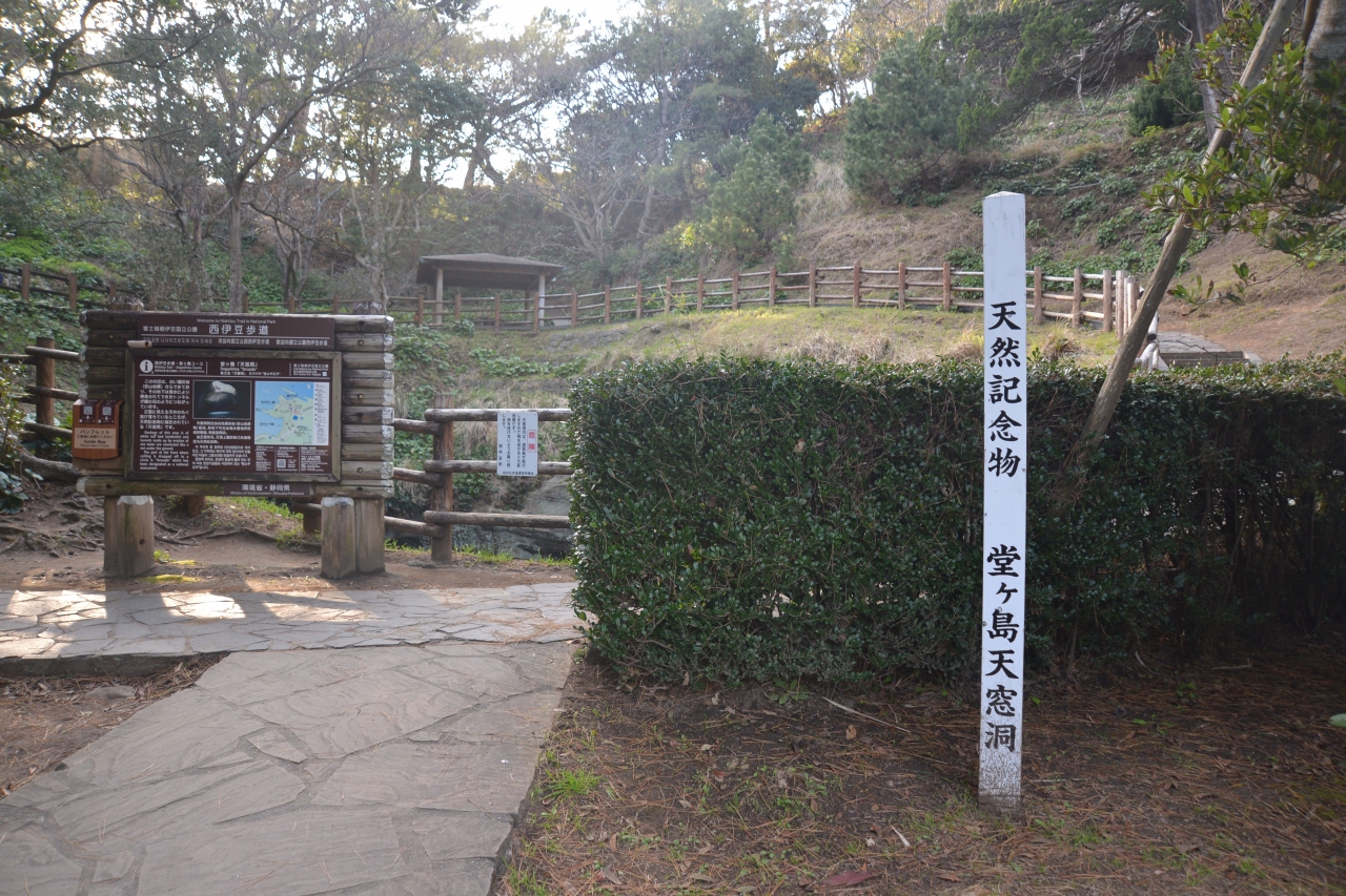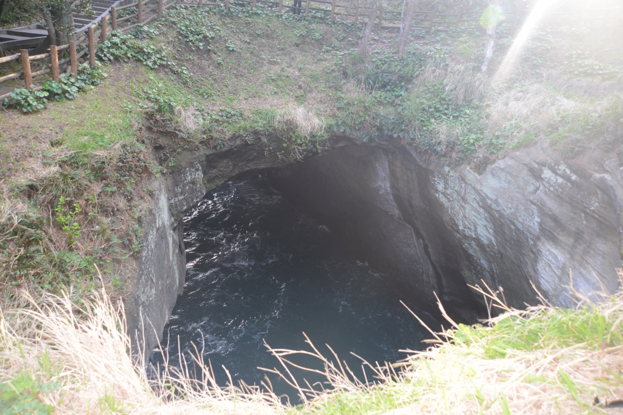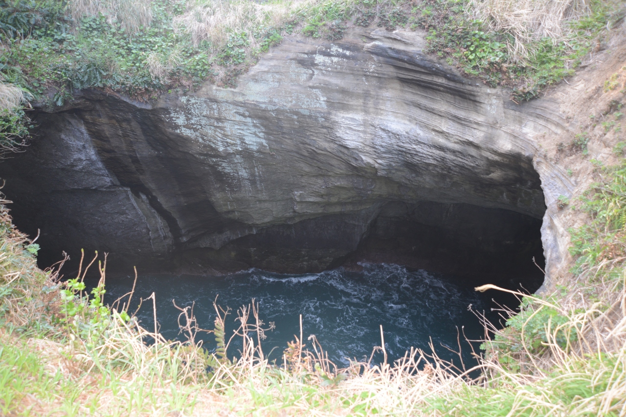 毎年堂ヶ島の温泉に休暇をとって行っています。公園の斜面の歩道にぽっかりと大きな穴が開いているところが「天窓洞」です。観光船に乗って下から見上げると穴が窓のように見えるのでしょうか。上から見ても迫力あります。