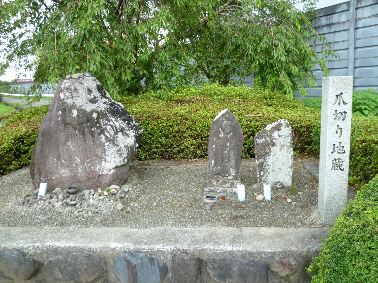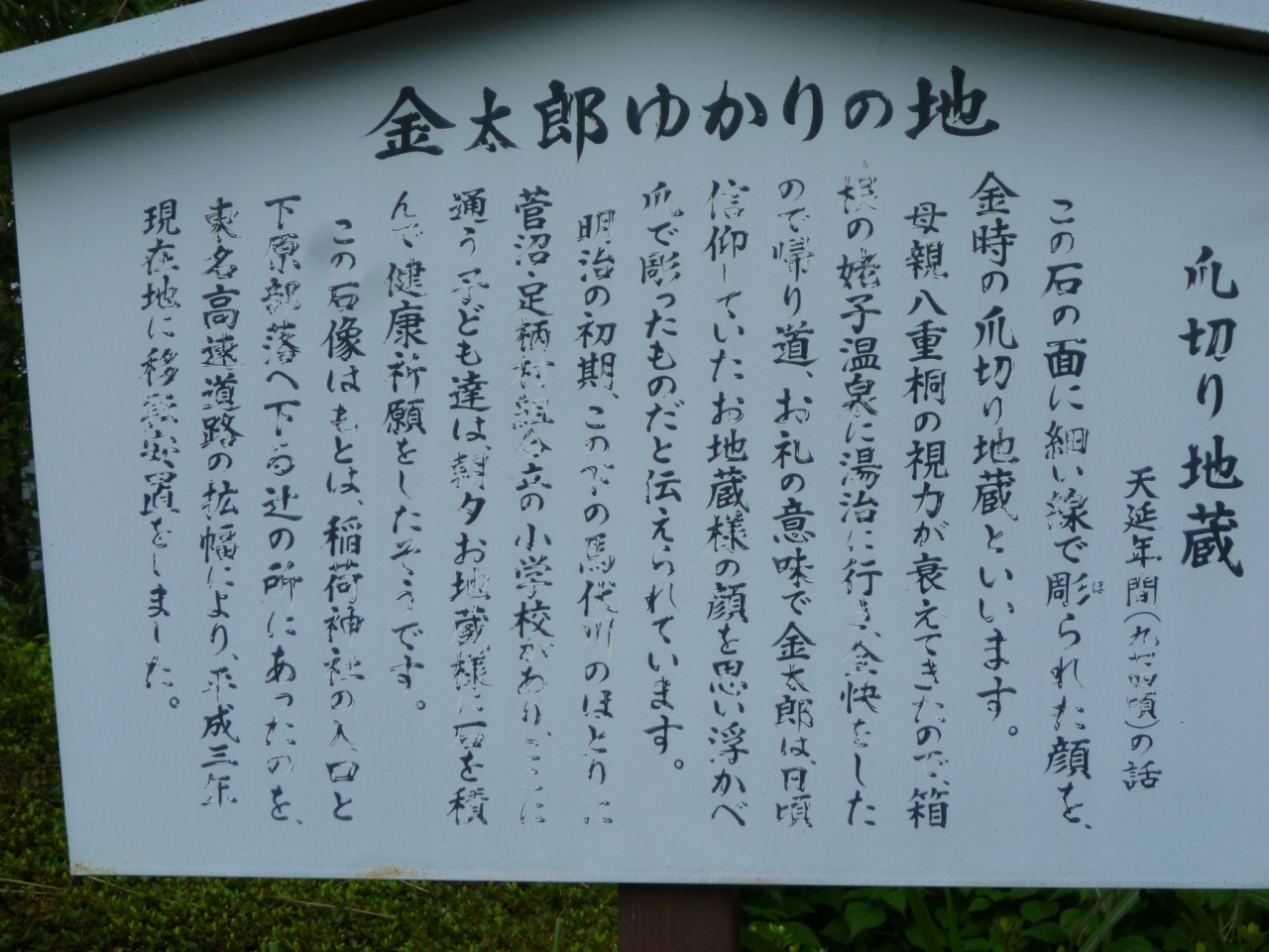 金太郎の母親の視力が悪くなり、箱根の温泉でよくなり、御礼にと爪でお地蔵さんを掘ったとされる石です。足柄駅から富士山方向に直進して、高速道を渡る手前左側にあります。向かいにポケットパークがあり駐車可能です。高速道を渡ったら竹之下の棚田があります。
