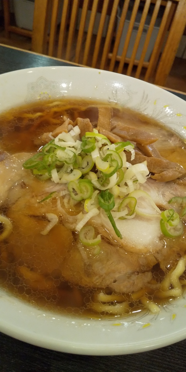 ラーメンは太麺であっさり透き通ったしょうゆスープによく絡む。
