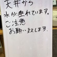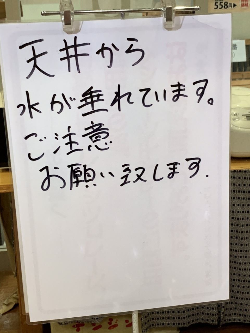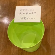 〈天井から 水が垂れています〉 と書かれて バケツが置かれていました。