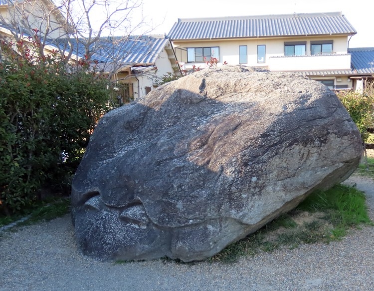 石舞台古墳から飛鳥駅へ向かう途中にありますが、隣接する家屋の陰になっていたため、近づいても場所がすぐわかりませんでした。生け垣と木柵でちゃんと囲われていました。確かによく見ると愛嬌のある亀の顔が彫られているように見えてきます。何のために作られたのかは現在も不明。有力説では当時の川原寺の四隅の境界を示すために置かれたもの、だそうです。
