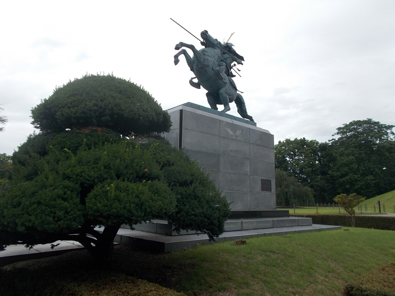 この最上義光騎馬像は山形城址霞城公園の中にあります。二の丸跡にあります。騎馬像は二の丸東大手門近くにあります。午が前足を上げた姿に騎乗する鎧兜姿の像です。躍動的なものであらあらしさを感じさせるものです。すばらしいです。