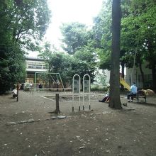 土のグラウンドに少しの遊具が一か所に固まっています。