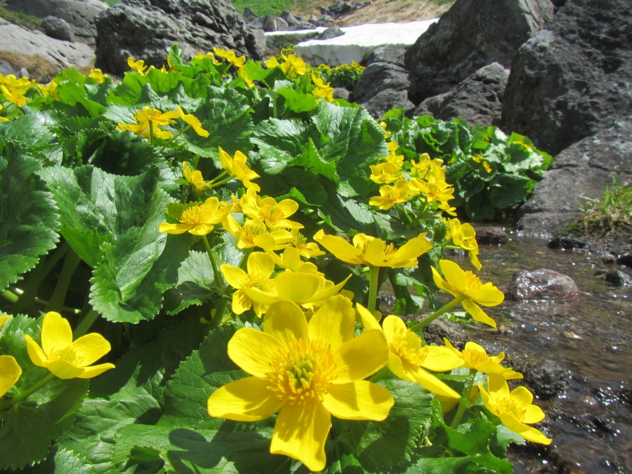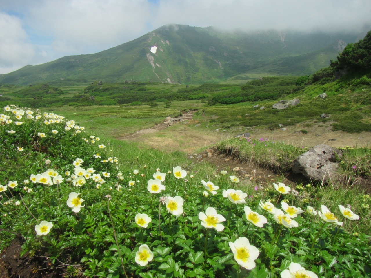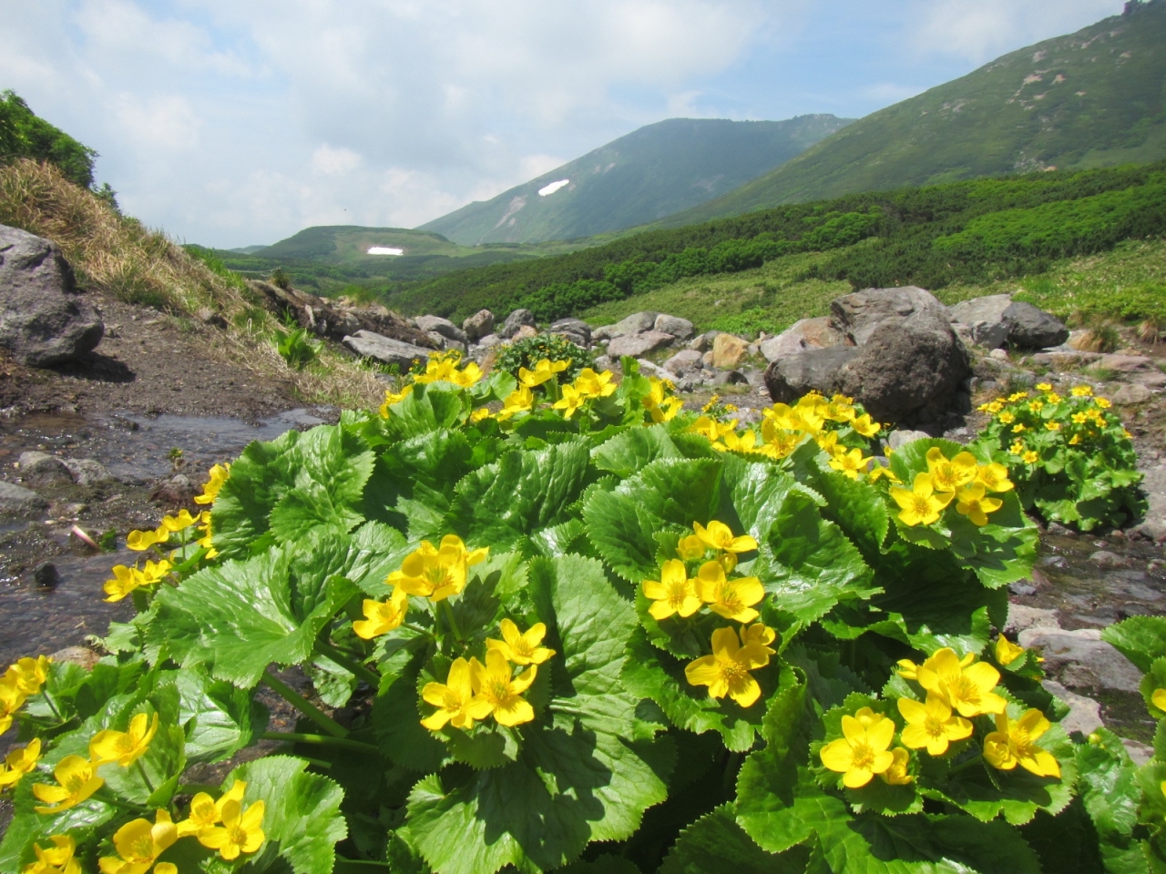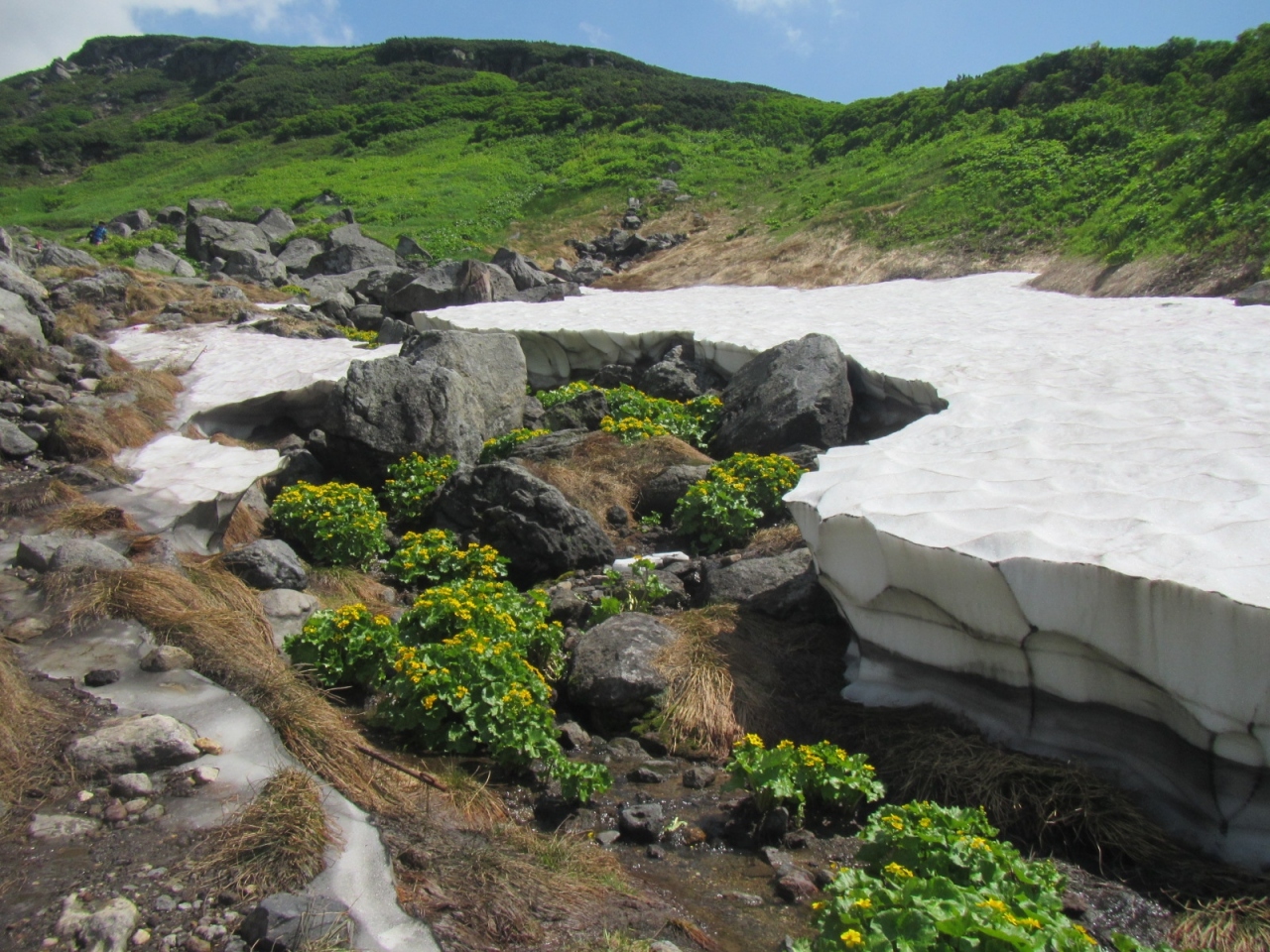 そのほか、中岳温泉に近いところでは雪渓がまだ残っていて、エゾノリュウキンカが咲いていたほか、キバナシャクヤク、ゴゼンタチバナ、エゾコザクラやちょこっとだけハクサンチドリもまだ咲いているのを見かけました。
