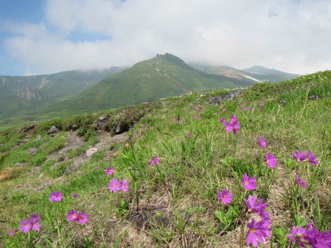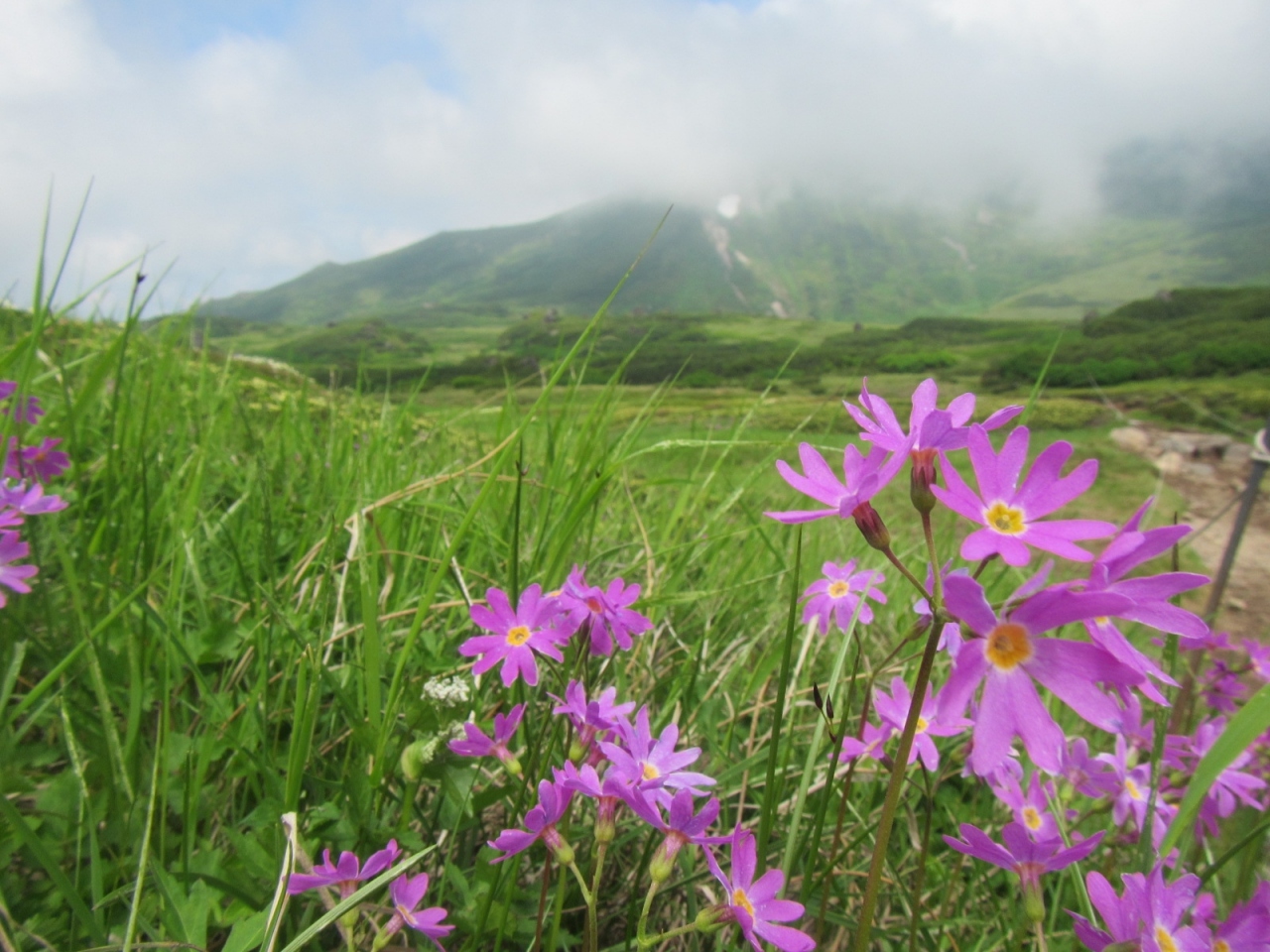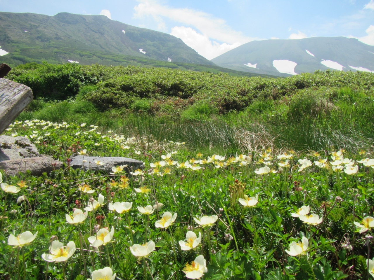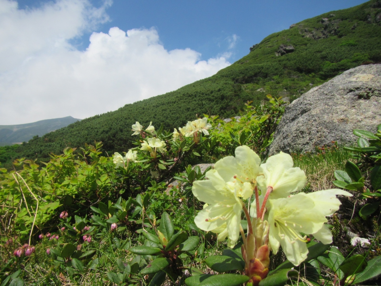 そのほか、中岳温泉に近いところでは雪渓がまだ残っていて、エゾノリュウキンカが咲いていたほか、キバナシャクヤク、ゴゼンタチバナ、エゾコザクラやちょこっとだけハクサンチドリもまだ咲いているのを見かけました。