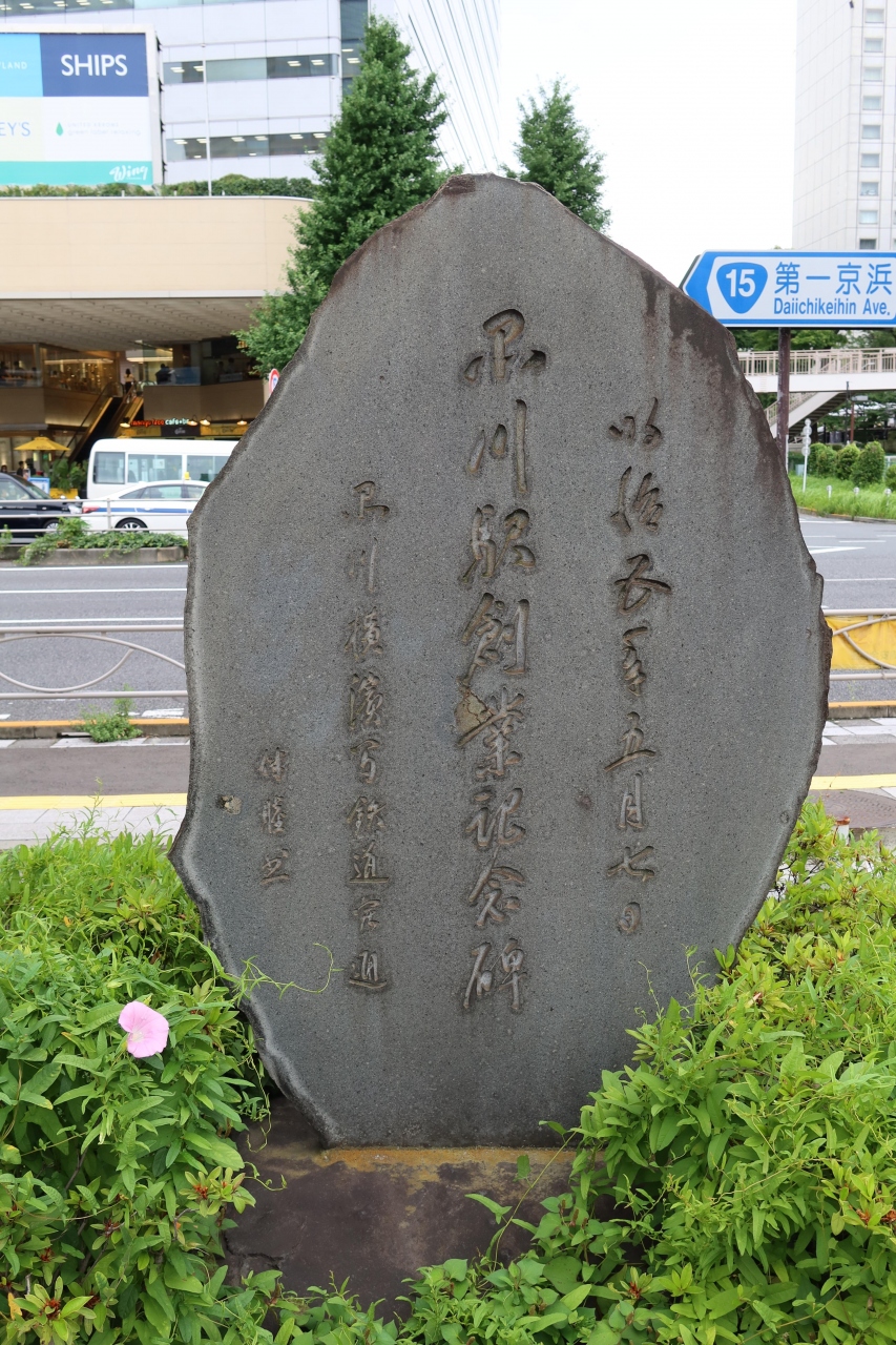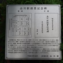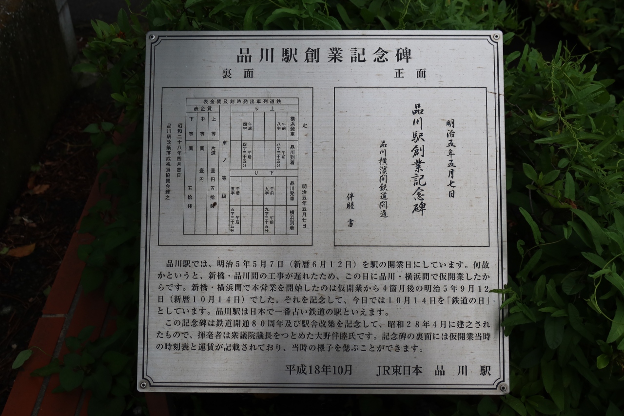 品川駅の高輪口、タクシー乗り場のあるローターリーの中に品川駅創業記念碑があります。新橋-横浜間に鉄道が開通する前に先駆け、品川-横浜間で仮開業した。大野伴睦によって書かれた記念碑には仮開業時の時刻表、運賃が裏に書かれており、ちょっと面白いです。