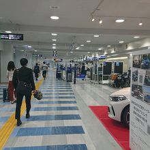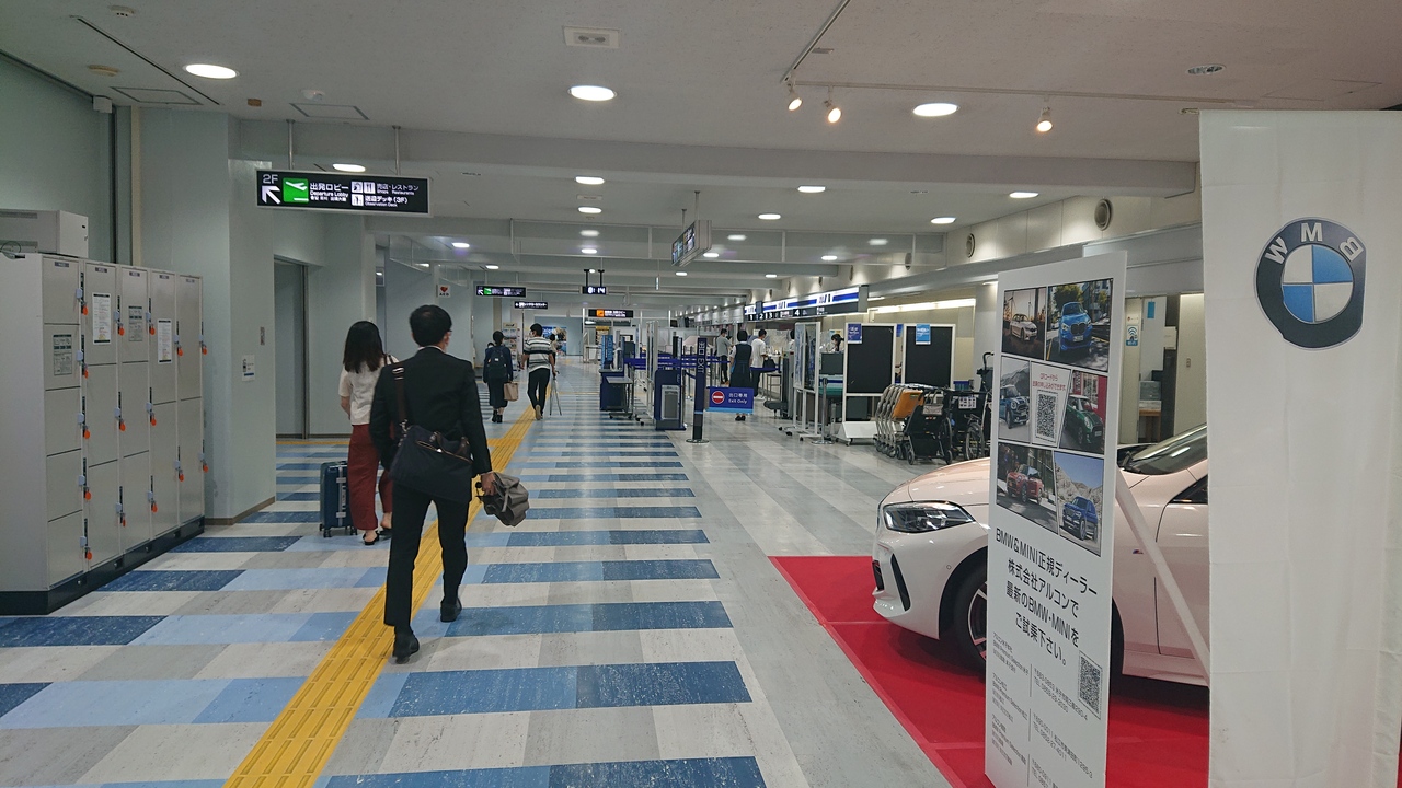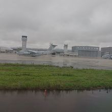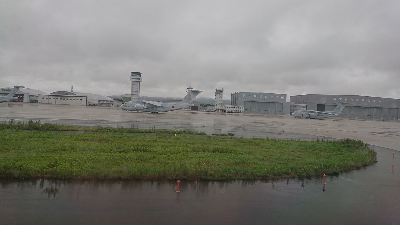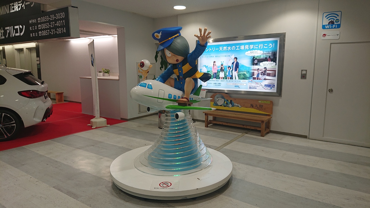 正式名称は「美保飛行場」。防衛省が管理する航空自衛隊美保基地で、滑走路を民間航空機が共用する空港です。境港市と米子市に跨がる場所にあり、米子市中心部から約11キロ。公共のアクセスは、米子方面は空港バスか境線、松江方面は空港バス。滑走路の一部は中海に突き出す形となっており、離発着の際、中海を眺めることができます。また、航空自衛隊専用のエプロンやハンガーが並んでおり、自衛隊機を観察することもできます。ターミナルは基地の東側にあり、ボーディングブリッジは3つ。1階にチェックインカウンター、到着フロアがあり、2階が出発ロビー。1階にはセブンイレブンと総合案内所のほか、鬼太郎が飛行機に跨がるモニュメントやゲゲゲの鬼太郎の写真スタンドがあり、撮影スポットになっています。