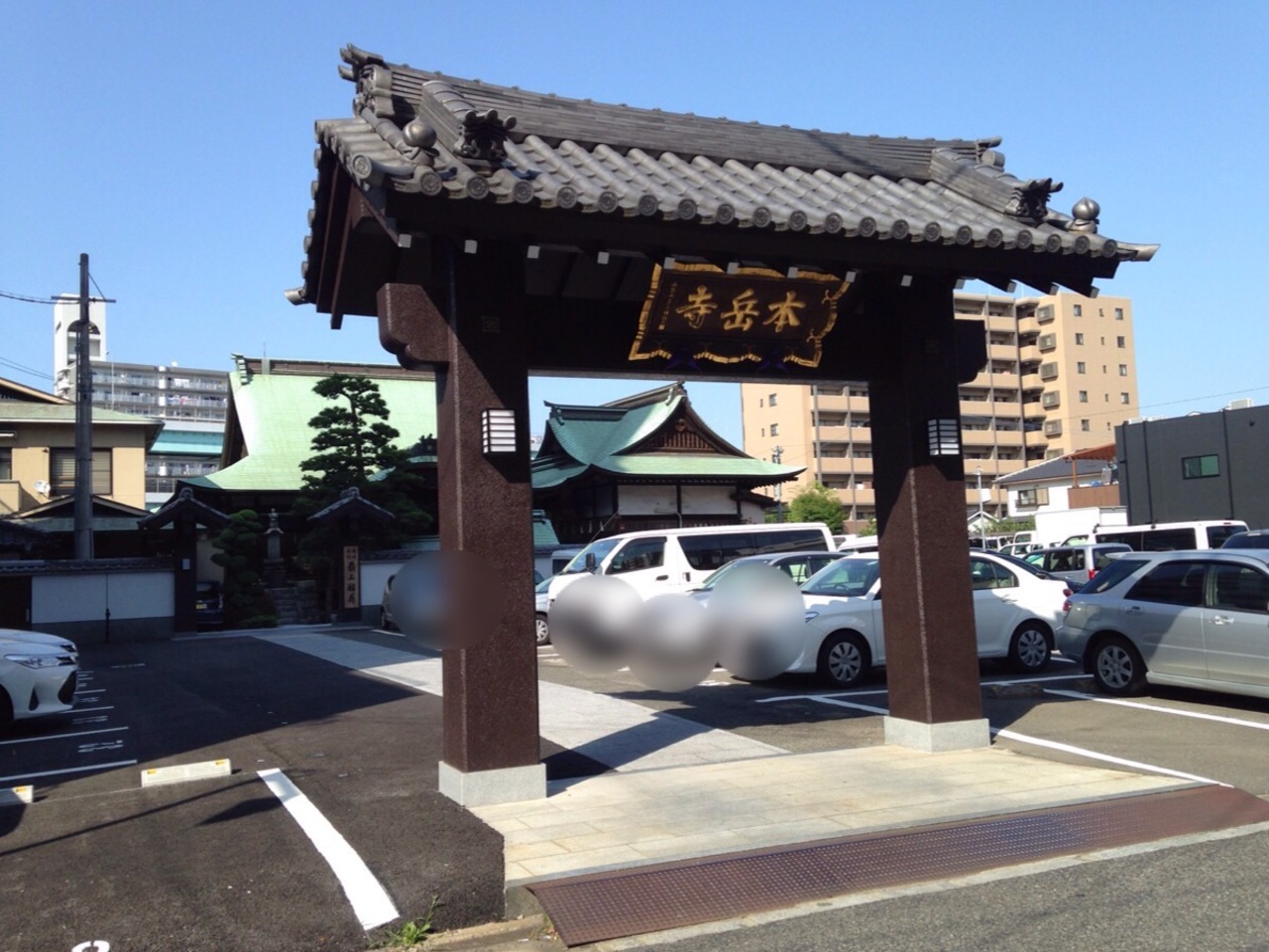 上呉服町の御笠川沿い、入定寺の近くにあります。駐車場より手前にある山門はどっしりとしていて大きく本岳寺の名が書かれています。これをくぐって進むと本堂の前の左右に傘をさしているように屋根がある門があって、なかなかに独創的な光景です。本堂の前面まで来ると緻密な木彫りの彫刻で装飾されていて、しばし見入ってしまいました。