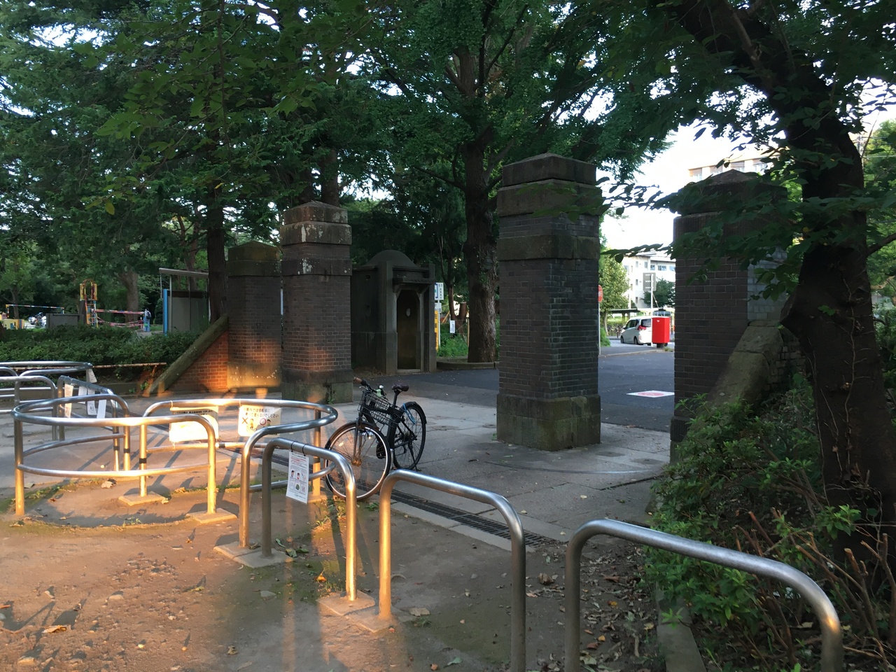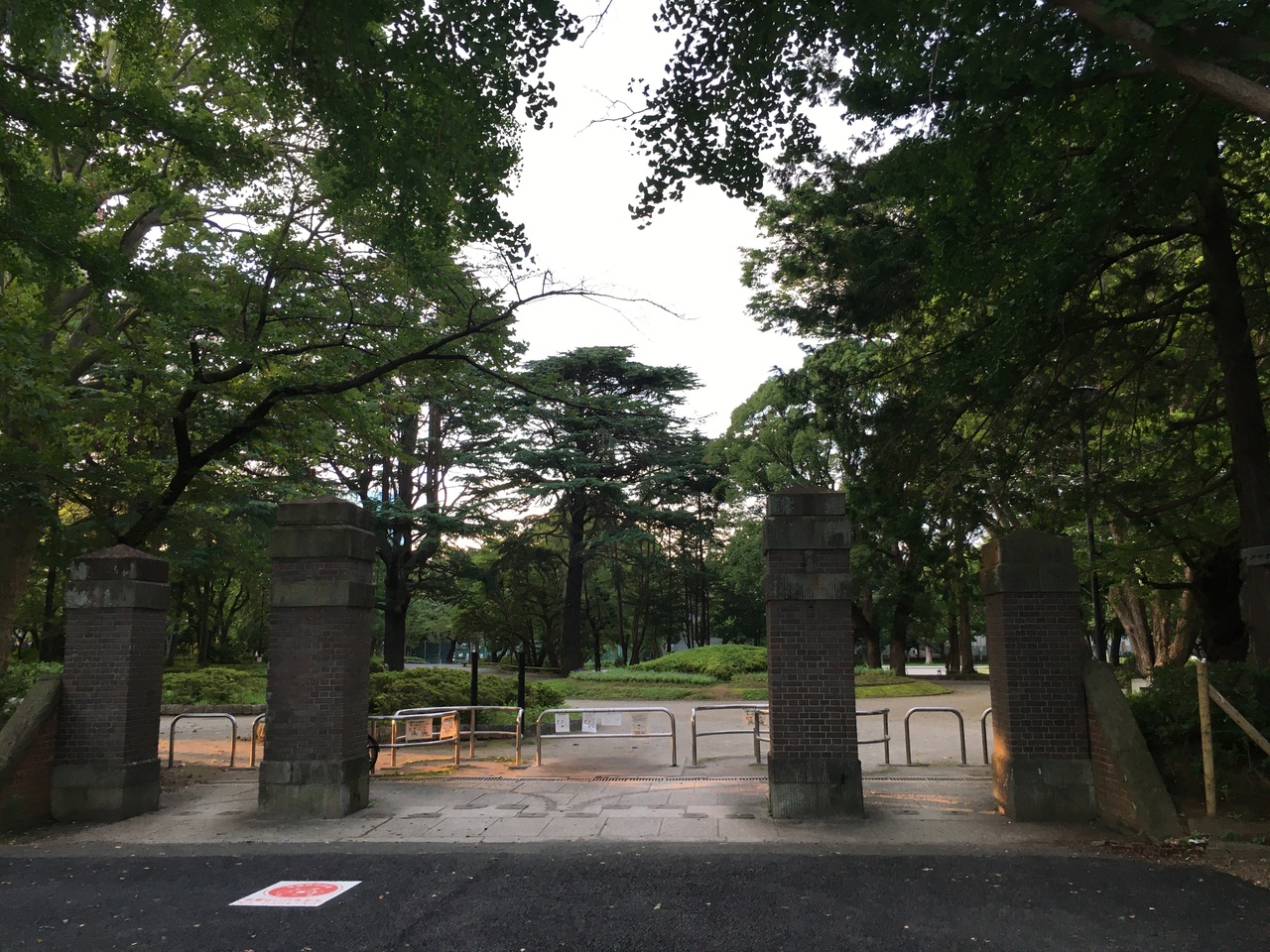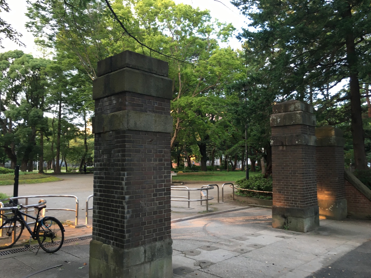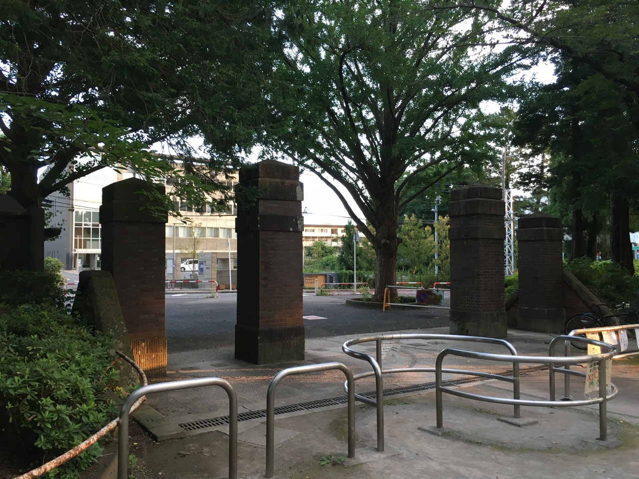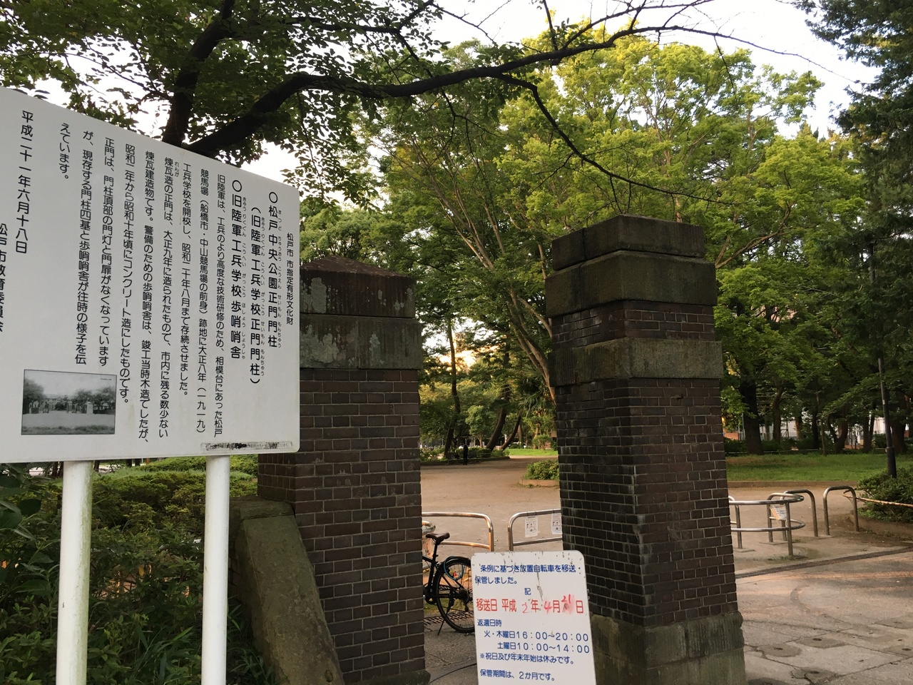 学校という名前が付いているので門をよく見ると学校の門柱に見えました。柱しか残っていないですがレンガ作りの歴史的を感じる柱でした。柱を越えると松戸中央公園が広がっています。柱は4本あり、夜見ると不気味に見えました。