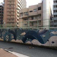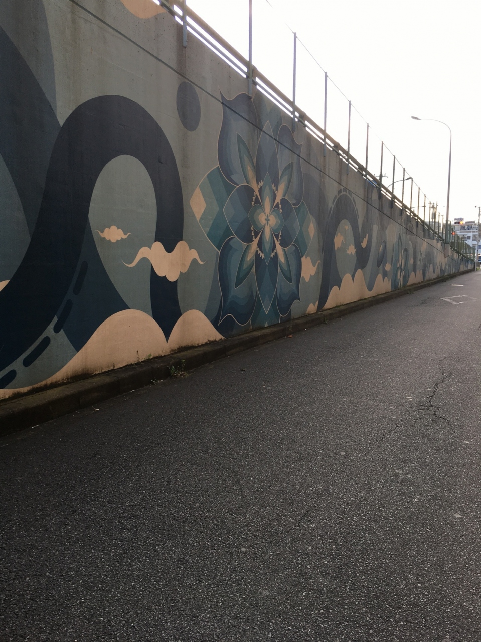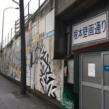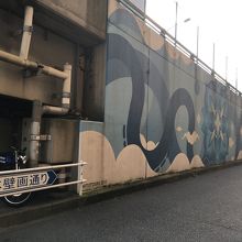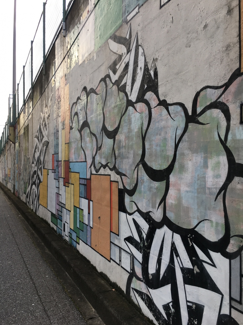 道路沿いの坂道の壁に落書きのような壁画がかかれていました。反対側にも同じような壁画がありました。看板まであり硬式に認められた壁画らしいですが、よく街中にはある落書きにも見えました。よく見ると落書きとは違いちゃんと描かれていることがわかります。