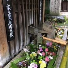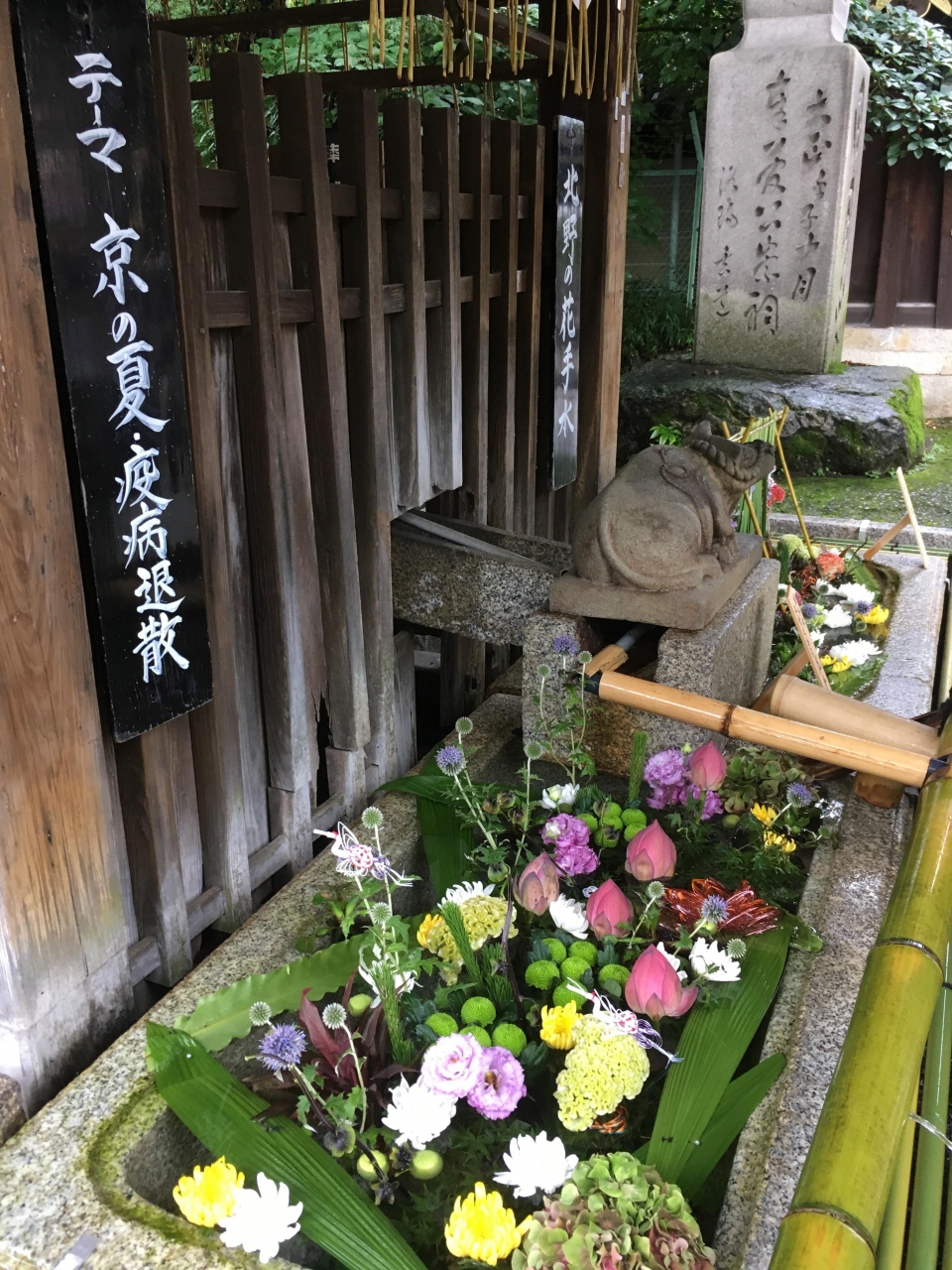 長い参道を歩き楼門を抜けると手水舎があり、鉢には花で埋め尽くされています。