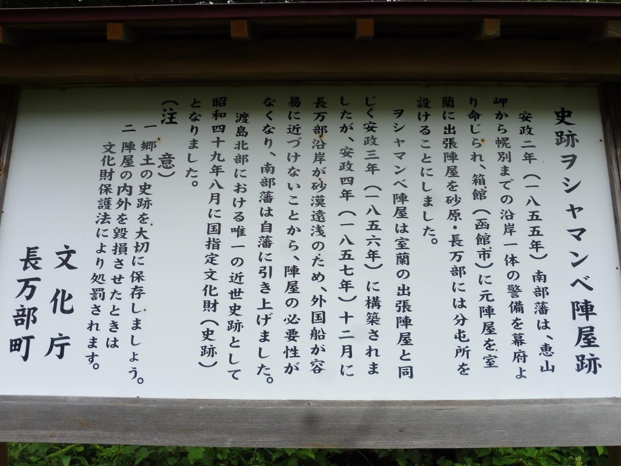 JR長万部駅構内の裏手の長万部温泉街の奥の丘に有る飯生神社敷地横に東蝦夷地ヲシャマンベ陣屋跡が有ります。