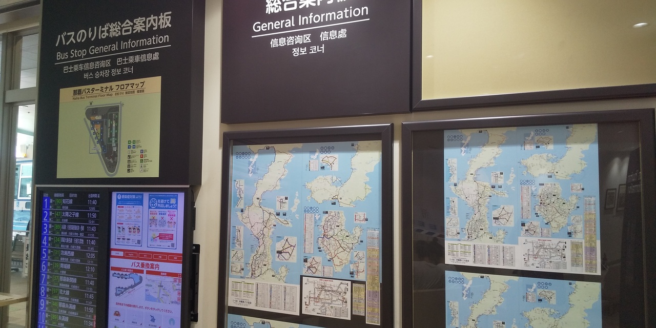冷房が効いた待合室、案内所やコンビニもあり快適です。待合室内では、沖縄の観光名所とバスでの行き方を、大型のスクリーンで紹介しています。